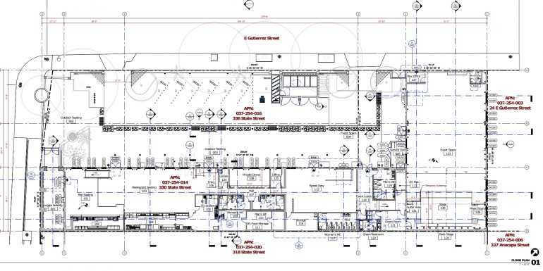 ••• The plan has changed a bit for 330 State Street (at Gutierrez): Last time it went before a city board, in March 2021, the layout included a bar; a kitchen; spaces labeled “food vendors, “bakery/coffee/dessert,” and “wine”; 3,400 square feet of seating area; a “lounge”; an outdoor “event area”; and a 900-square-foot “display space.” Now, in the plans submitted in advance of the May 11 meeting of the Historic Landmarks Commission, there’s a restaurant and bar, a “speakeasy,” and an event space with green room, box office, and “guitar area.” (The renderings at the bottom are from last year, but I’d wager they haven’t changed all that much.) P.S. The agenda says there will be bowling lanes, but a rep for the owner says that’s not the case.