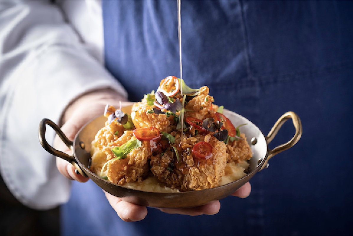 ••• Finch & Fork at the Kimpton Canary hotel reopened yesterday, with updated decor and menus. Above: fried chicken “oysters” with potato puree and hot honey sauce. UPDATE 5/15: Christine noticed something about the menu that I didn’t—everything is $10! (Not really; the prices are on the online version.)