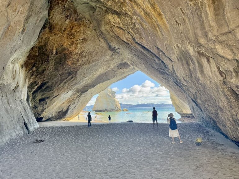 Instead, I made Adam go to The Lost Spring, a kitschy hot-pool complex—Disneyland meets the Playboy Mansion grotto—that all the other patrons took weirdly seriously. A far more satisfying outing was kayaking to Cathedral Cove, where a cave tunnel links two idyllic beaches.