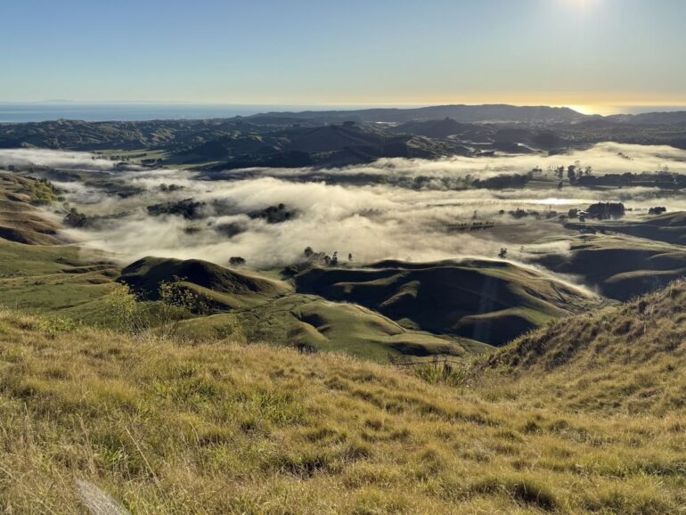 And we finally did a real hike: the Giant Circuit trail in Te Mata Trust Park. As the sun rose, it lit up the lowland fog to spectacular effect. Plus: redwoods.