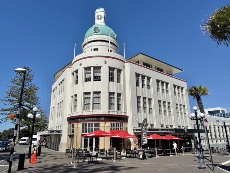 By the time we arrived in Napier, we had realized that the towns are not the best part of New Zealand. It’s known for its art deco architecture, and some of the buildings are lovely, but the storefronts on the main strip have been covered in schlock; South Beach it ain’t. To cap it off, we had a truly awful lunch. Throughout the non-Auckland parts of the country, there’s a sameness to the menus—it felt mandatory for every menu to have a fried chicken sandwich, an open-faced steak sandwich, and pork belly in some fashion. (Vegetables are minimal.) On the plus side, the coffee is great.