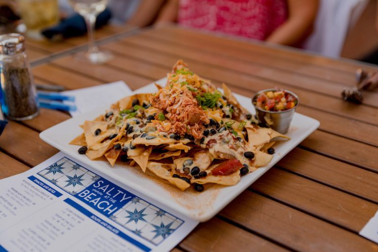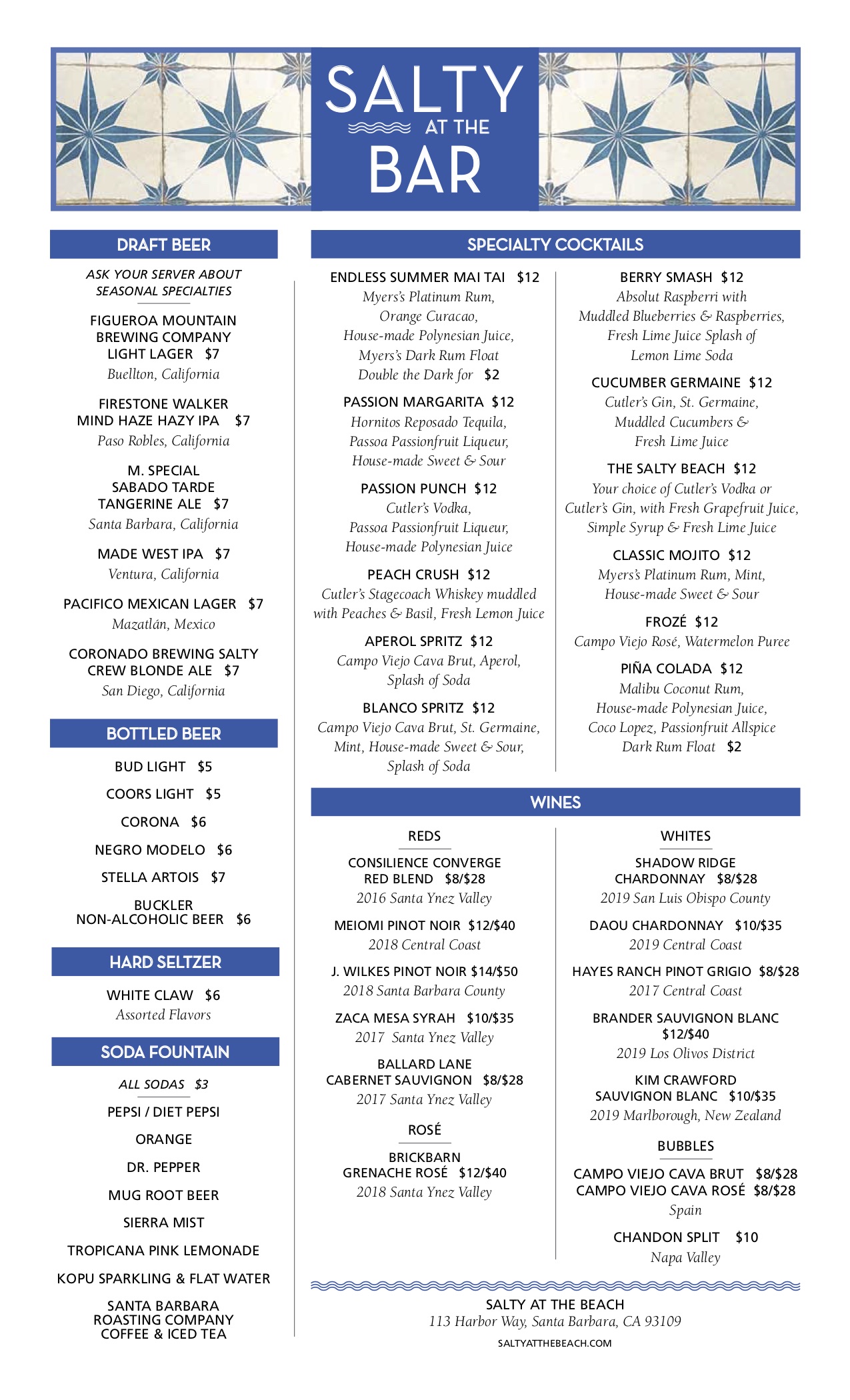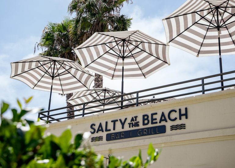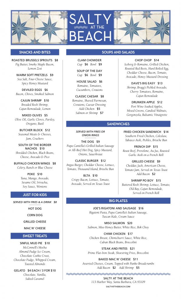 Salty at the Beach, one of two new restaurants at the Santa Barbara Harbor, opens this Thursday. It’s the upstairs venue in the building that used to be home to Endless Summer and Chuck’s Waterfront Grill. (Chomp on the Rocks, a burger joint, will soon follow downstairs.) For now, Salty is opening at 11:30 a.m. daily and closing at 8 p.m. Sunday through Thursday and 9 p.m. on Friday and Saturday. Photos from the PR representative give a fair sense of what to expect from the bright, airy interior, even if you have to look past the happy staff. But first, the menus….