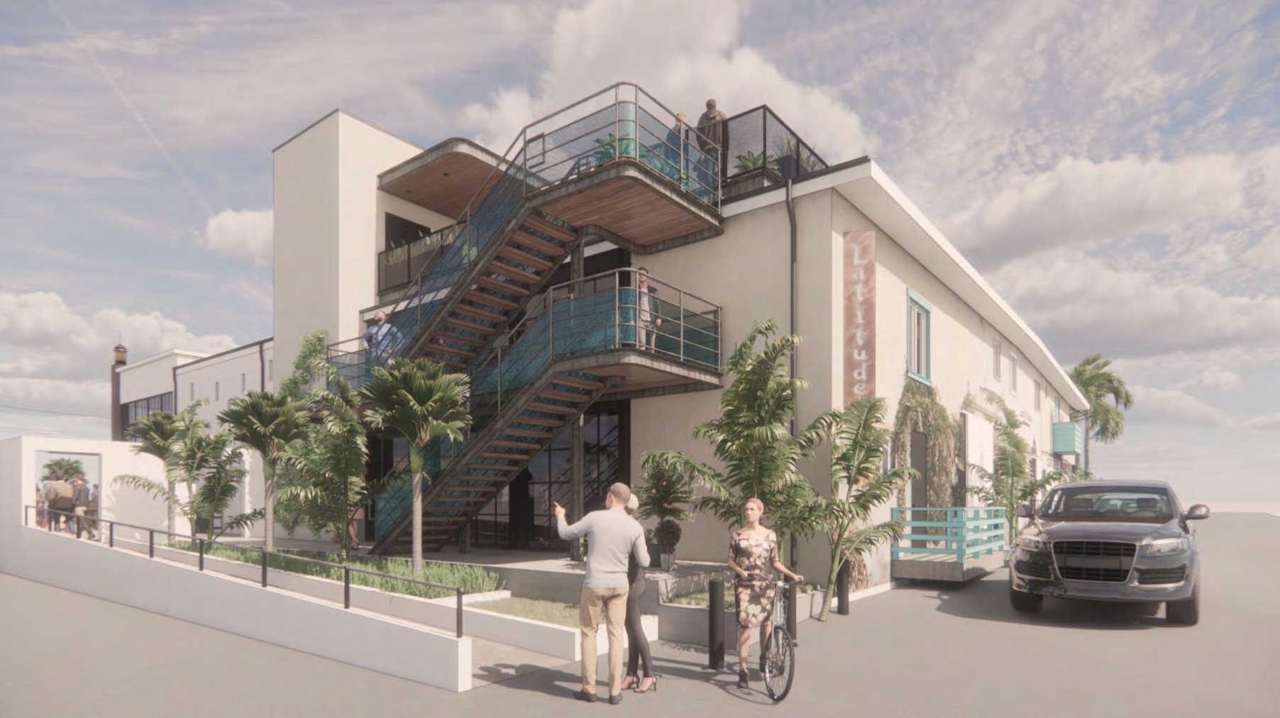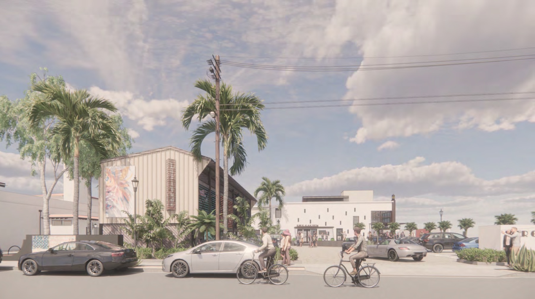 …to something much, well, funkier. It’s a straight-up homage to the art studios slated to be demolished as part of the full-block project between Yanonali, Santa Barbara, Mason, and Gray. (This round of renderings has certainly been given a hazy retro glow, no doubt in an effort to assuage board members’ fear of the new.)