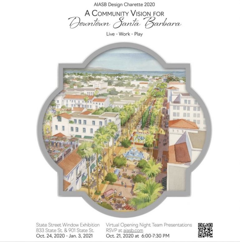 ••• From the Santa Barbara chapter of the American Institute of Architects: “Grab a glass of wine [on October 21] and hear fellow community members share their designs and illustrations for a reimagined downtown. The reception culminates a summertime design charrette hosted by the Santa Barbara AIA Chapter. Altogether, 16 teams of architects, landscape professionals, planners, engineers, artists, and interested community members spent their summer analyzing the State Street corridor and individual blocks to integrate more housing, enhance open spaces and connectivity, and improve the vitality of downtown. They will share their ideas in a quick presentation format at the virtual reception. Sign up to attend via Zoom at aiasb.com.” Also, starting October 24, there will be window displays at 833 and 901 State Street.
