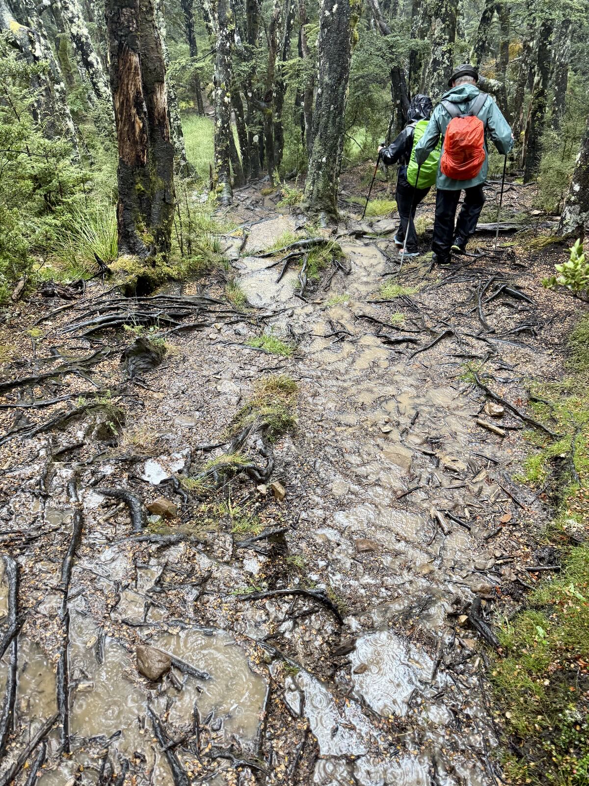 The second special hike was the Beasley Spur Track, which I did most of alone because (a) I hike fast, and (b) the rain got heavy and everyone else turned back. It has been a long time since I hiked in the rain, and maybe never like that: my glasses kept steaming up, and my pants weren’t very wide, so the water ran down my legs and into my boots. By the time I got to the payoff view, from a ridge between two dramatic valleys, I was soaked to the bone. As soon as I would think that I couldn’t possibly get any wetter, I’d feel the cold finger of wetness probing somewhere new. On the way down, when I caught up to fellow hikers, the trail turned into a stream, and we walked right in the water. Thank goodness that most of the hotels have laundry facilities—and that the Backroads app has a location feature, or I might still be up there.