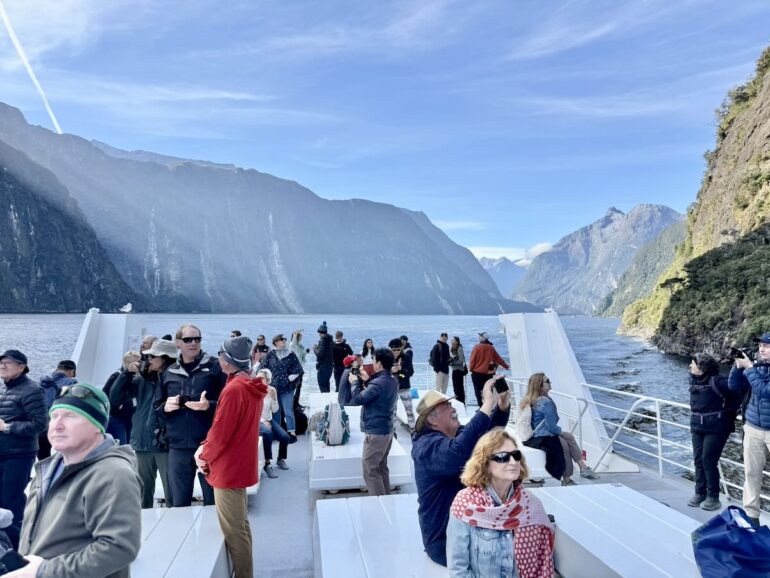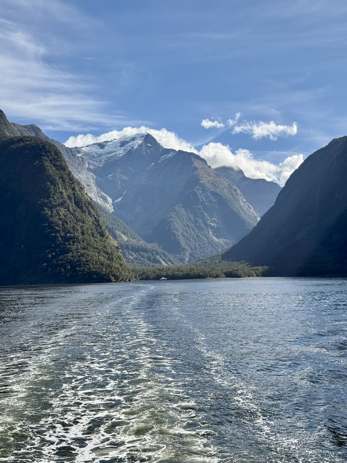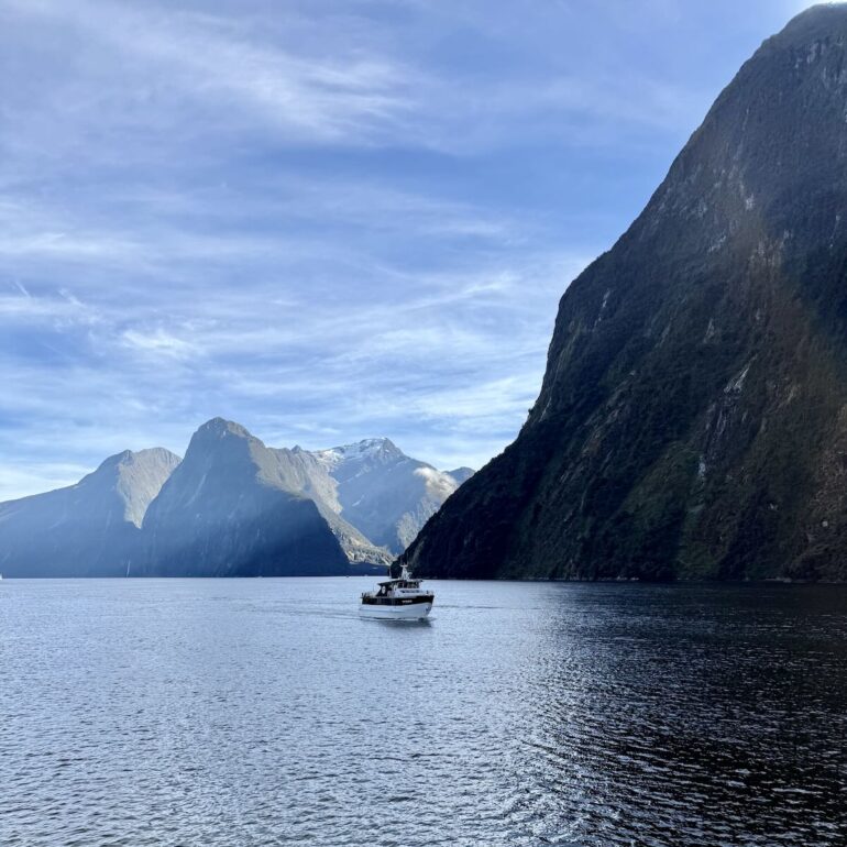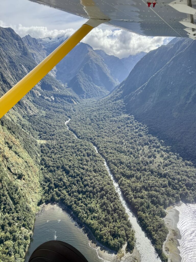 The itinerary includes two add-ons for an extra cost. We skipped the helicopter flight to see Franz Josef Glacier, but we did do the flight to Milford Sound, which we then explored via boat. The flights took different routes coming and going, and they were mesmerizing. You arrive at Milford Sound by flying down the length of it, flanked by the steep mountains.