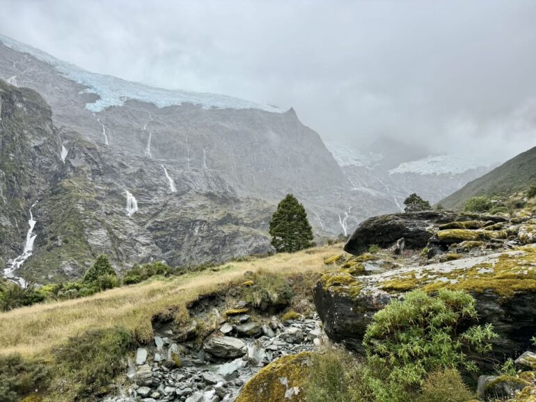 The third memorable hike was on Rob Roy Track, where we experienced four seasons in one day. The morning started out with clouds and light rain but then the skies cleared. And the many waterfalls near the glacier were our reward for enduring the rain a few days prior.