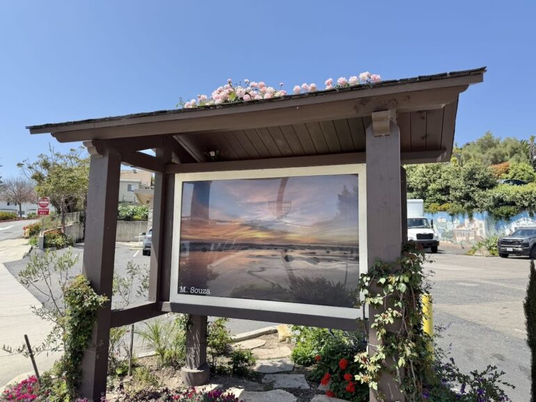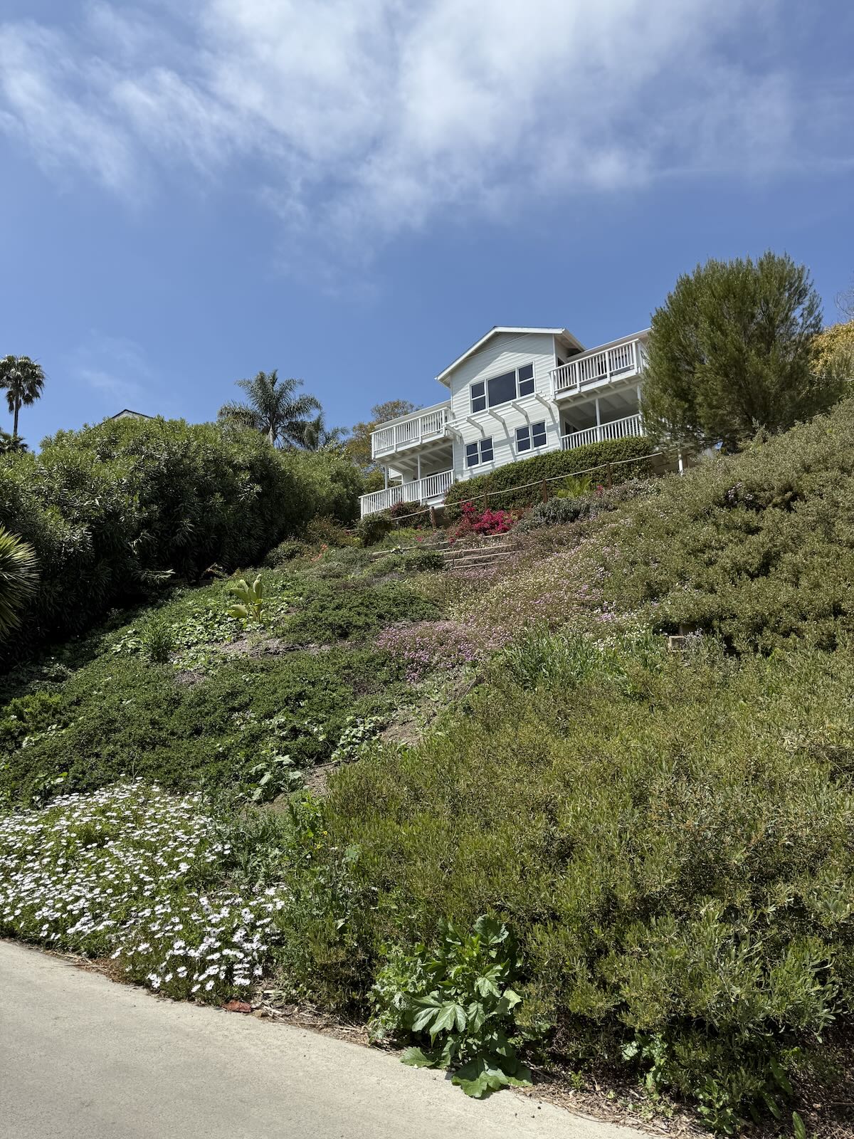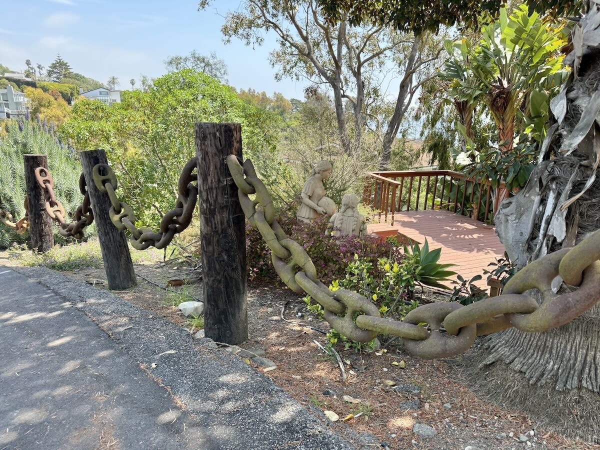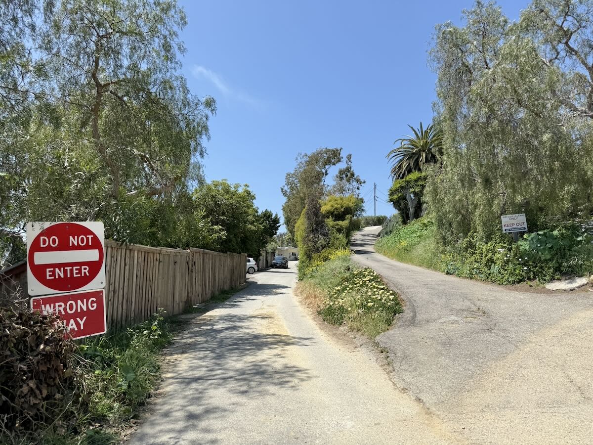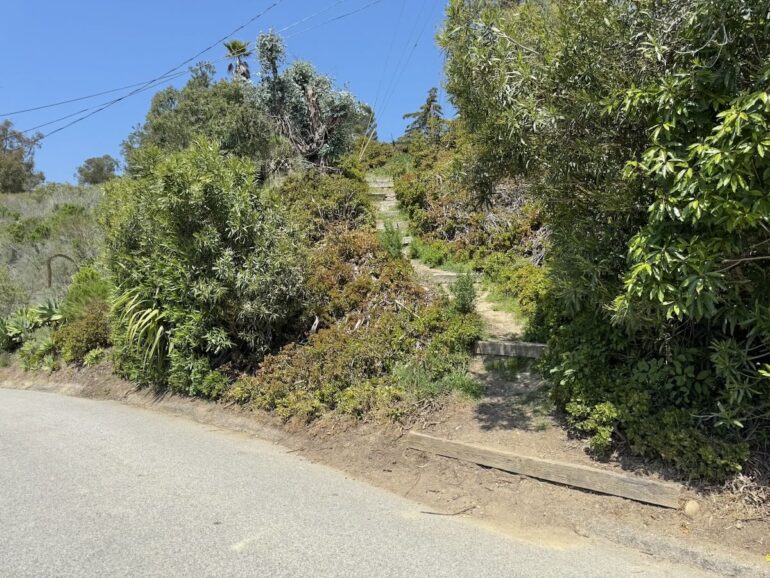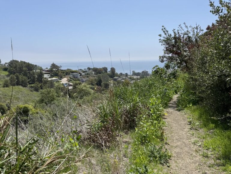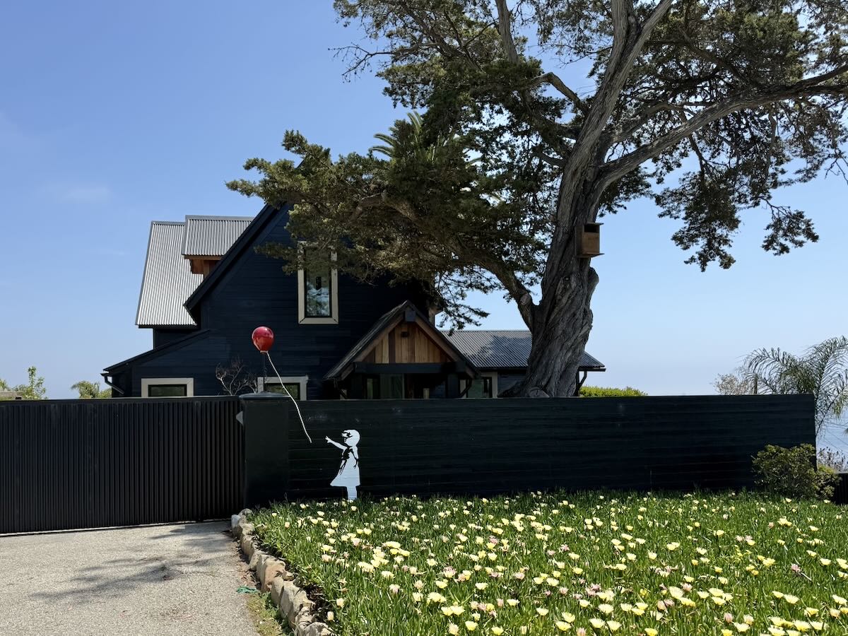 Yet another Montecito Trails Foundation trail, this one called Sears Trail, links Lillie/Sears with a spur off Ortega Ridge Road. You get a pleasant view down toward town, along with a good look at the Banksyesque artwork outside 226 Ortega Ridge Road. The red balloon is the globe of a light fixture, and I presume it can be illuminated—possibly, but not necessarily, in a way that would call to mind “Roxanne” or “Red Light Special.” (The free association never stops.)