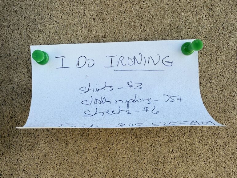 I can’t resist a community bulletin board like the one in the post office parking lot. Three bucks to iron a shirt seems like a good deal to me, but then I have no idea how to iron and I’m not learning now. Years ago, when my husband and I were getting ready for something, I pointed out that my shirt was wrinkled. “It’s part of your brand,” he replied.