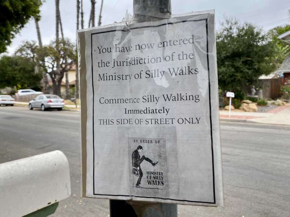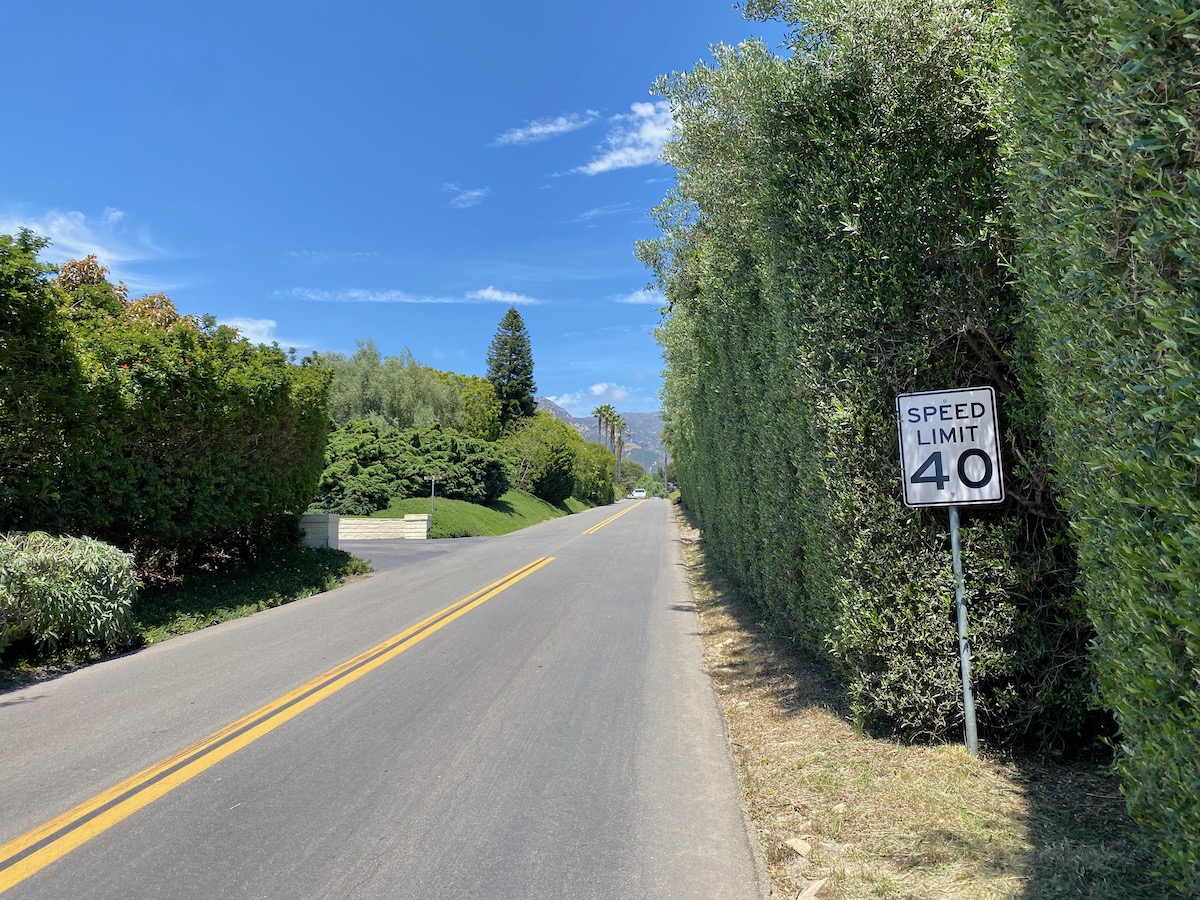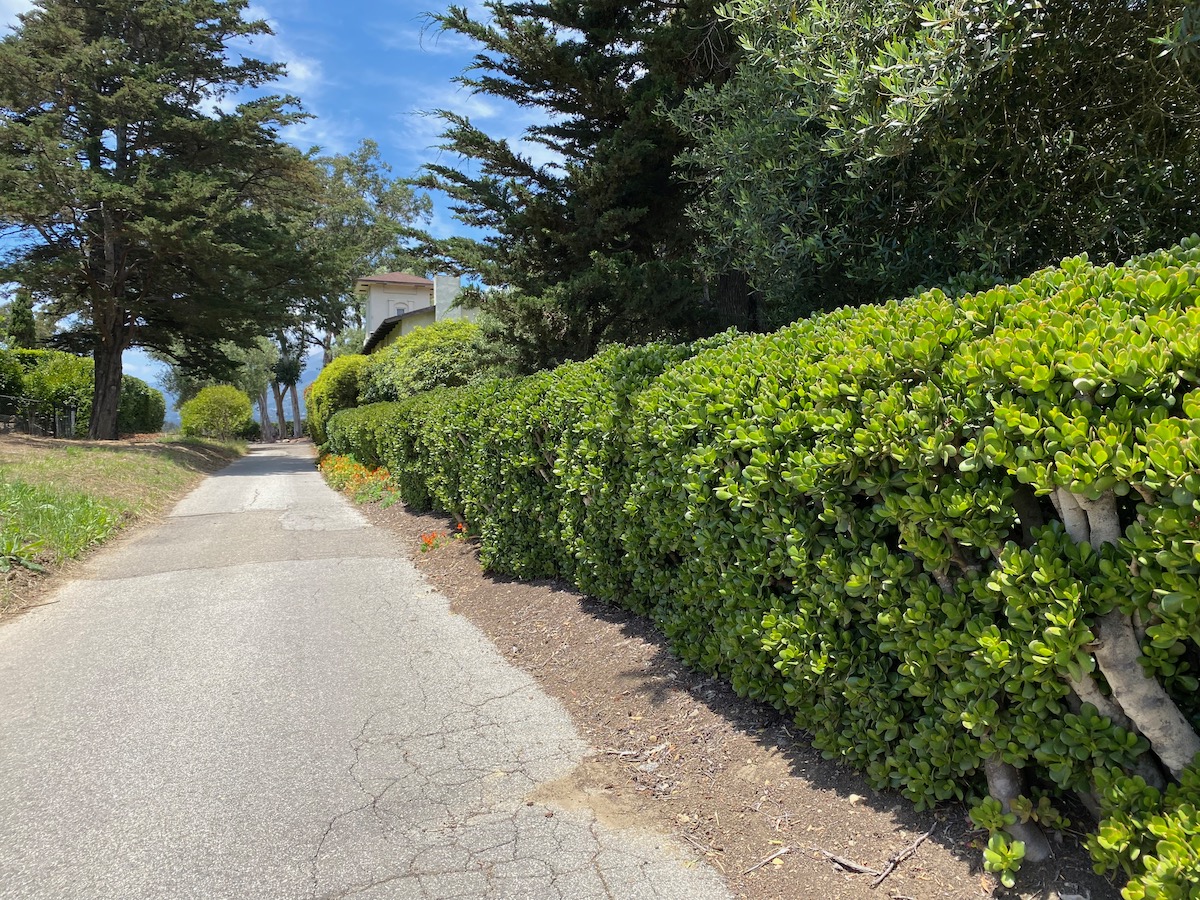 I began to feel like I was trespassing, so I turned around—possibly too soon, because the map appears to indicate a trail down to Lillie Avenue in Summerland. (UPDATE: And apparently, I missed a Banksy-ish artwork). As the lane nears Ortega Ridge Road proper, it turns very pretty, with an amazing jade hedge.