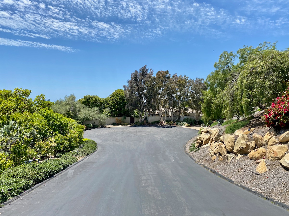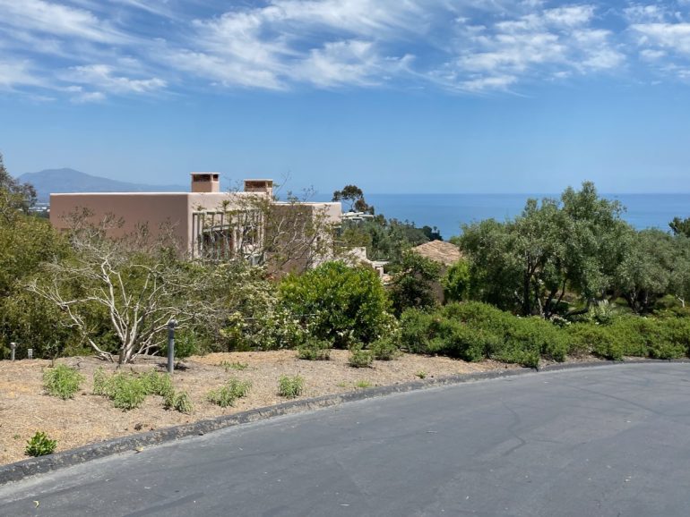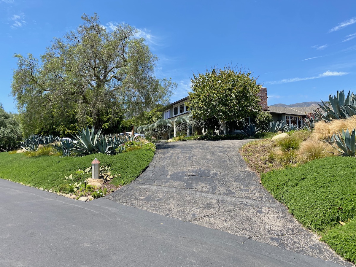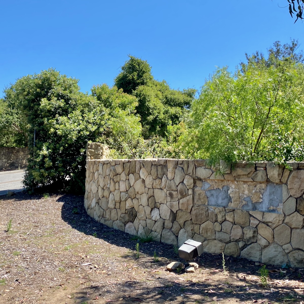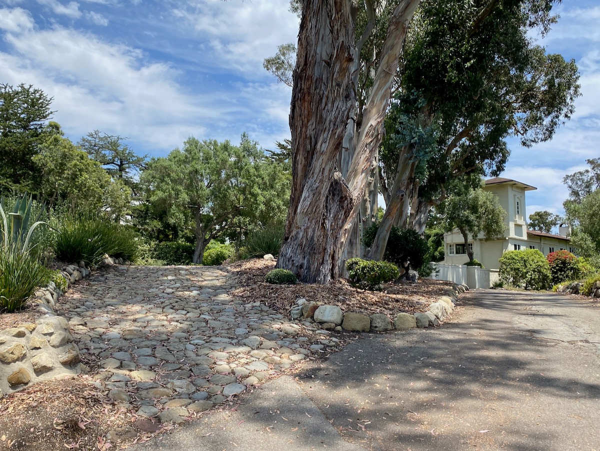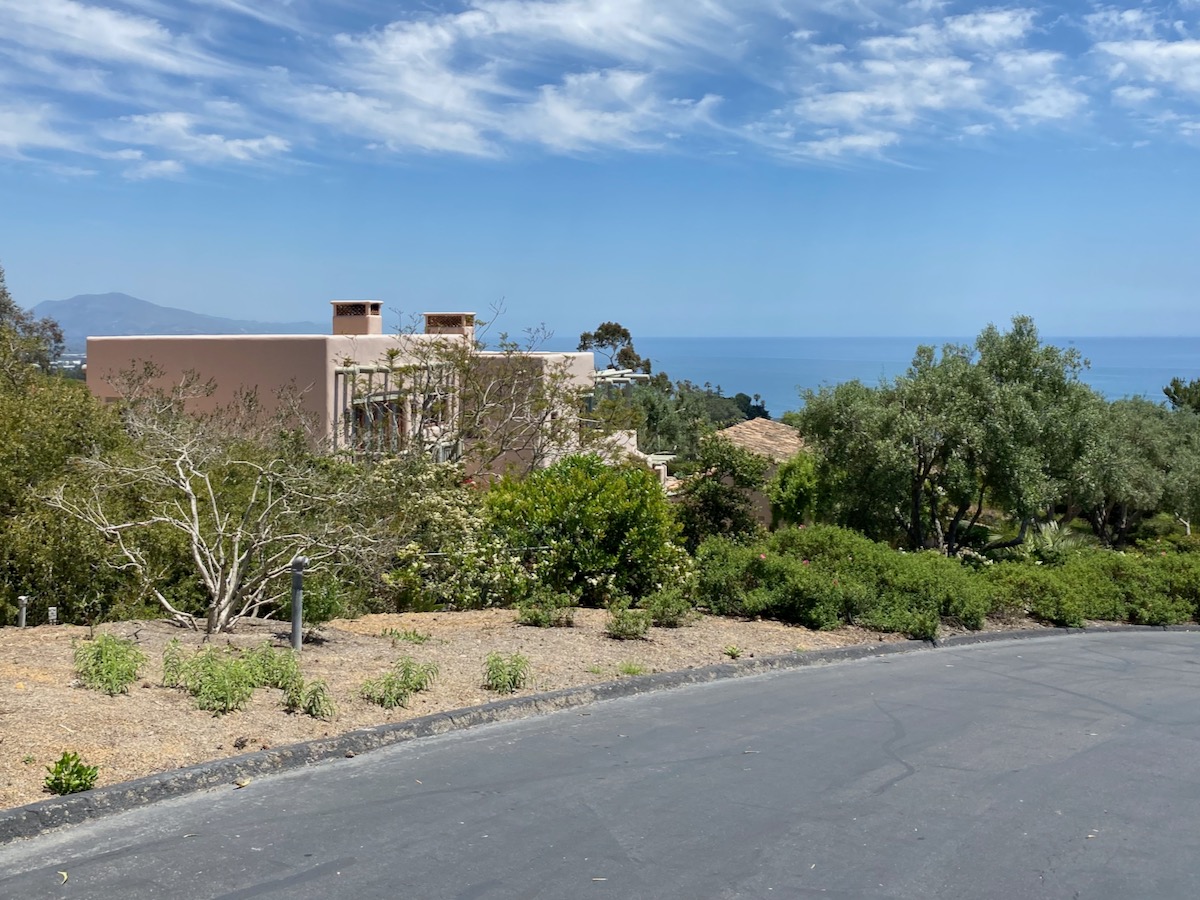 While on Ortega Ranch Lane, I noticed these steps down to the street, so I figured there had to be a trail leading to Summerland—otherwise, I couldn’t see why the homeowner would’ve bothered. I was right, but it turns out that I had already passed the trail. One of the houses at the end has a sumptuous motor court and pergola, and while I admire the effort to hide the utility infrastructure, it stopped short of a total win.