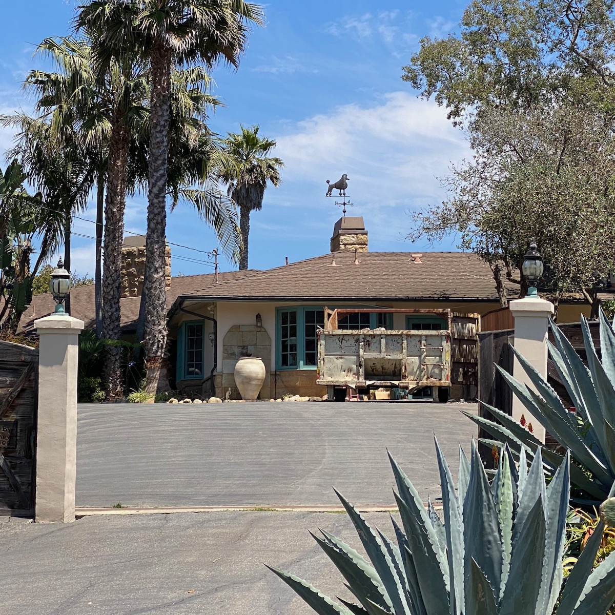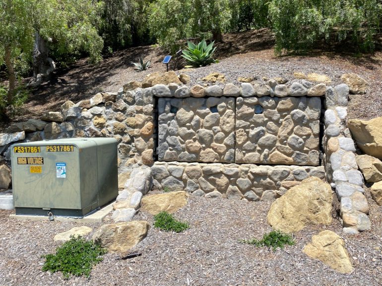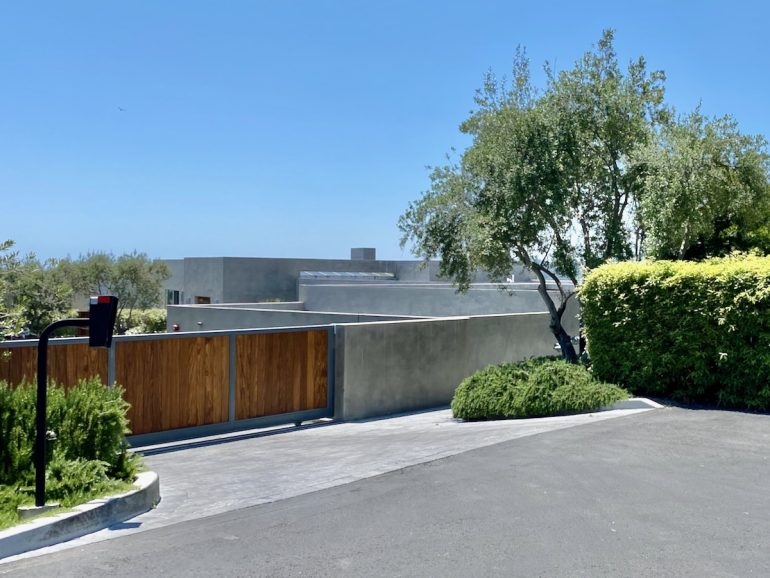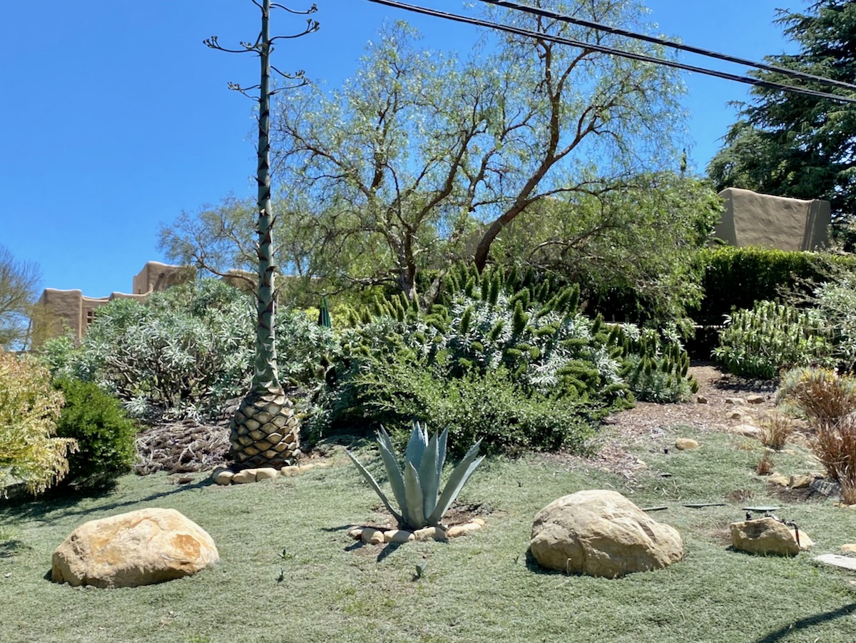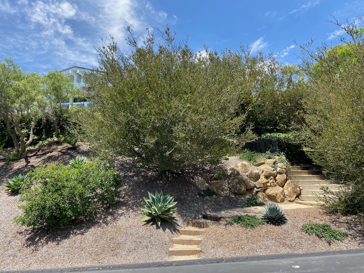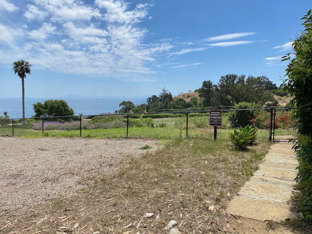 While on Ortega Ranch Lane, I noticed these steps down to the street, so I figured there had to be a trail leading to Summerland—otherwise, I couldn’t see why the homeowner would’ve bothered. I was right, but it turns out that I had already passed the trail. One of the houses at the end has a sumptuous motor court and pergola, and while I admire the effort to hide the utility infrastructure, it stopped short of a total win.