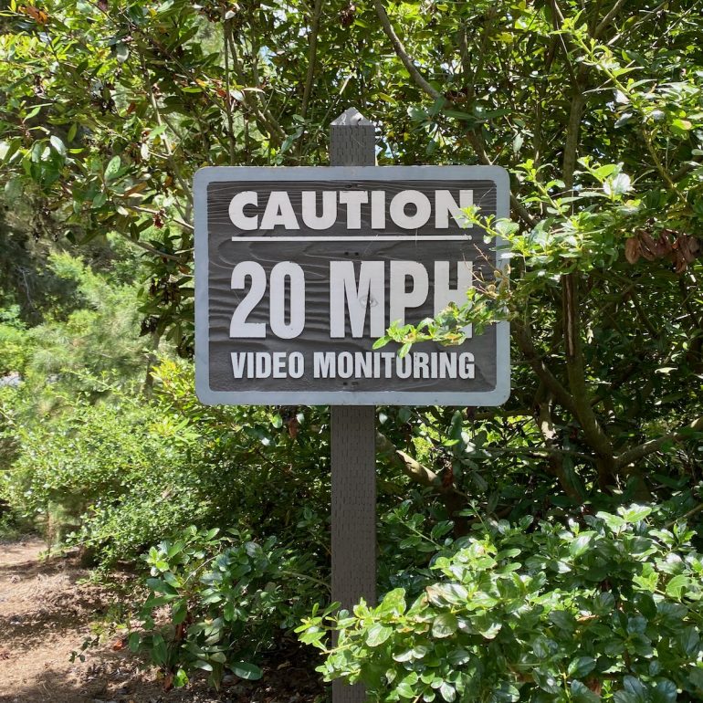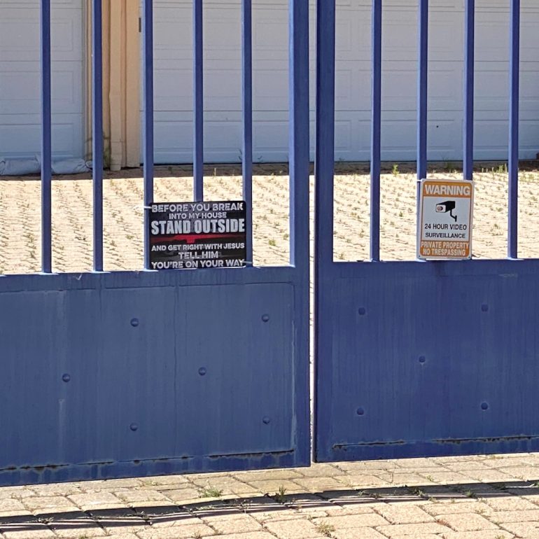 I can’t say I’m a fan of this architecture, but the sign on the gate made me laugh. The homeowners most fussed up about security—certain celebrities aside—always seem like the least obvious targets.