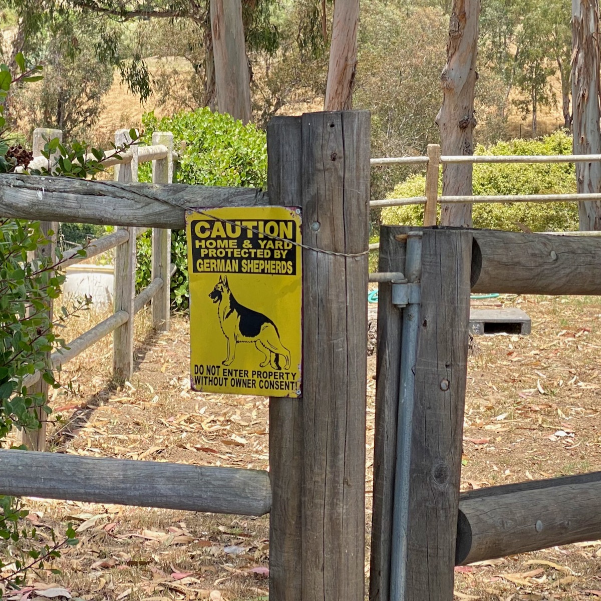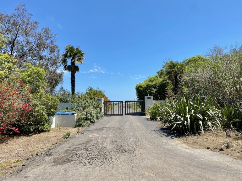 To its right is the Summerland Heights community’s open space and, at its far end, 222 Ortega Ridge Road, a house that’s part of the Summerland Heights community but only accessible via the lane. And to the left is a sign with a German shepherd that looks more happy than threatening. (Note to self.)