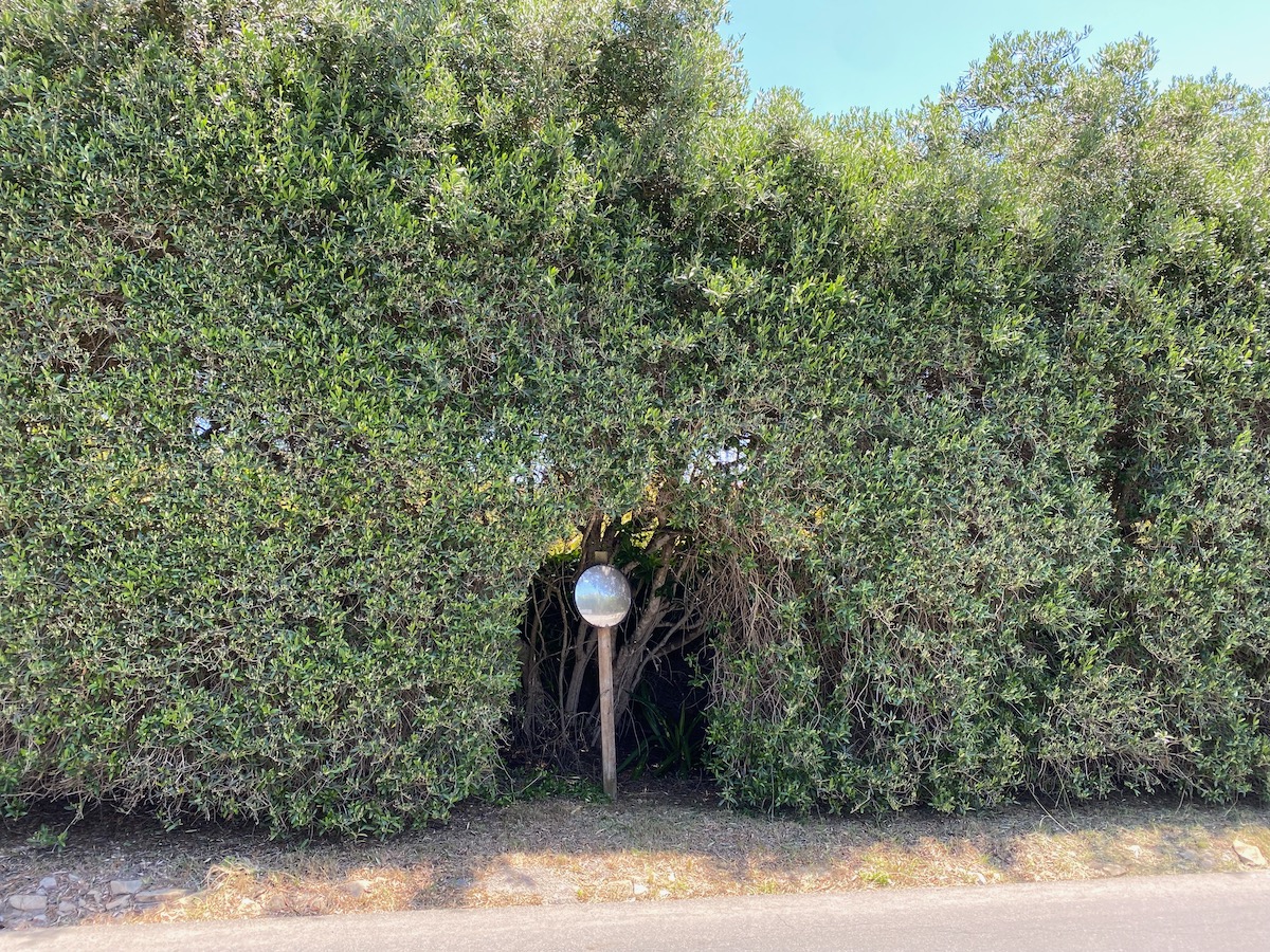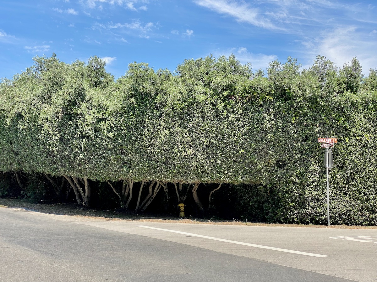 The giant (olive?) hedge at the corner of Greenwell has cut-outs for a hydrant, a speed-limit sign, and a mirror.
