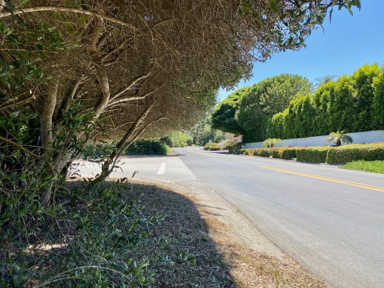 Looking back to Ortega Ranch Lane, you can see the trail running parallel to the road, along with the cut-through by that fresh little hedge.