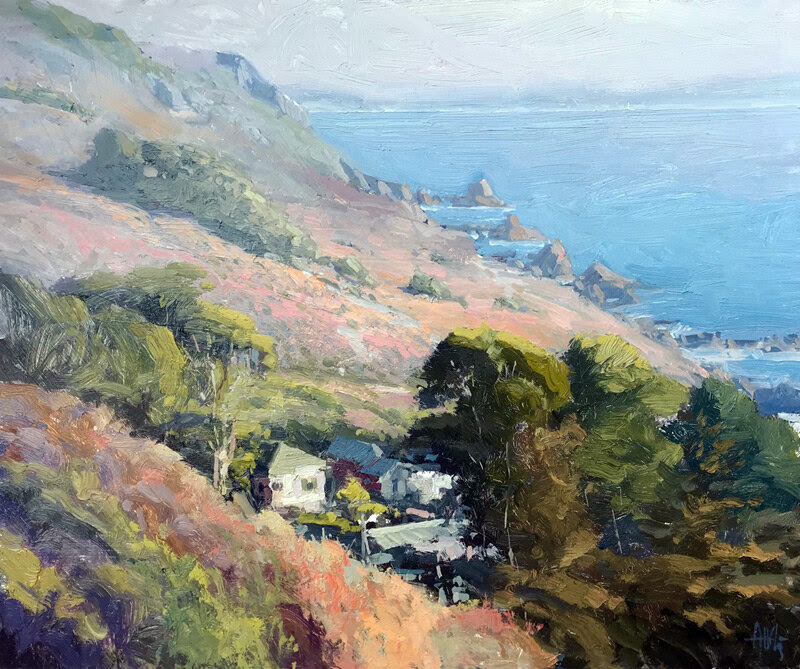 ••• San Francisco’s Thomas Reynolds Gallery has chosen 1331 State Street (Sola/Victoria) for its 26th-annual holiday exhibition, and there’s a chance the gallery will make it a permanent home. About the show: “Our inaugural exhibition brings Sandy Ostrau, who paints at the Sea Ranch, back to Santa Barbara. Sandy is a proud graduate of UCSB, where she starred on the women’s soccer team. Her juicy paintings of life on the California coast—north, central and south—are among the most exciting works of our time.The exhibition also includes work from the estate of Ken Auster, the Laguna Beach surf artist who became one of California’s preeminent plein-air painters, then perfected his of-the-moment style painting the streets, bars and restaurants of San Francisco and NewYork. We’re also pleased to present the bold and colorful abstract paintings of Santa Barbara’s own Marge Cafarelli, owner of the Public Market, plus other gallery artists.” Below: Auster’s “Slide Ranch” and Cafarelli’s “Sunset Over Stearns Wharf.”