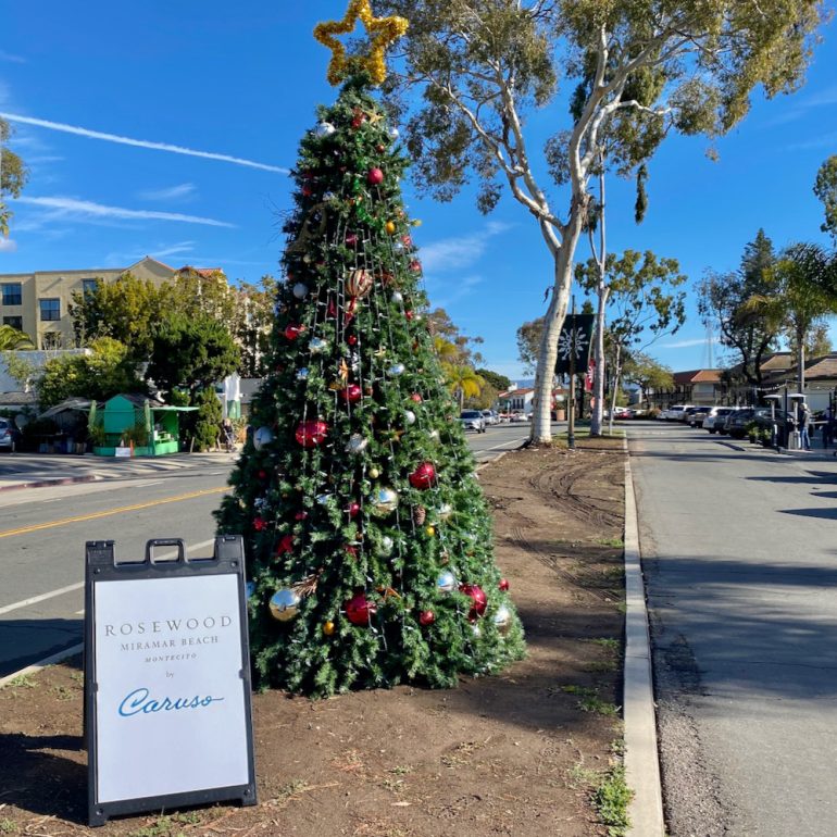 Very tacky sign next to the Christmas tree on Coast Village Road advertising the Rosewood with Caruso on it. Guess he needs more money.