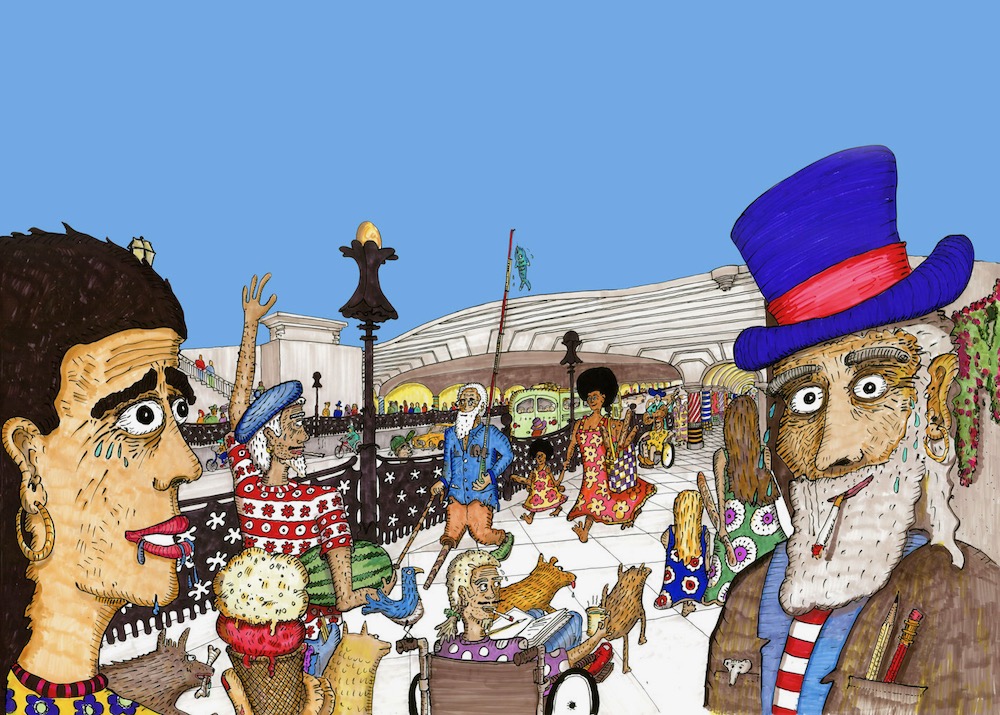 ••• ARTchitecture opens September 16 at the Thomas Reynolds Gallery: “Nearly a dozen of Santa Barbara’s finest practicing architects who also paint, primarily in watercolor, will be featured in the exhibition. Among them are Marc Appleton, who helped organize the exhibition, Anthony Grumbine, Stephen Harby, and Jeff Shelton. Also included are Domiane Forte, Henry Lenny, John Margolis, Sean McArdle, Tom Meaney, Alexis Stypa, and Qing Xue.” Pictured above: a detail from “State Street Underpass” by Jeff Shelton, apparently channeling R. Crumb. (In case you’re unaware, Shelton is designing changes to the part of State Street that runs under Highway 101.)