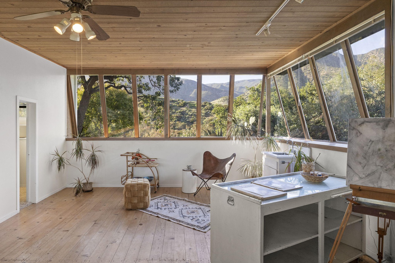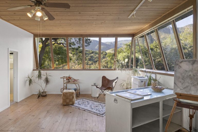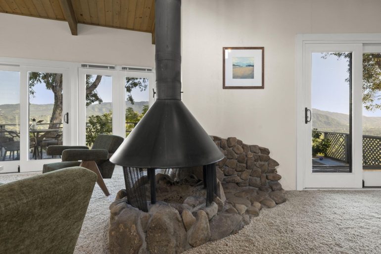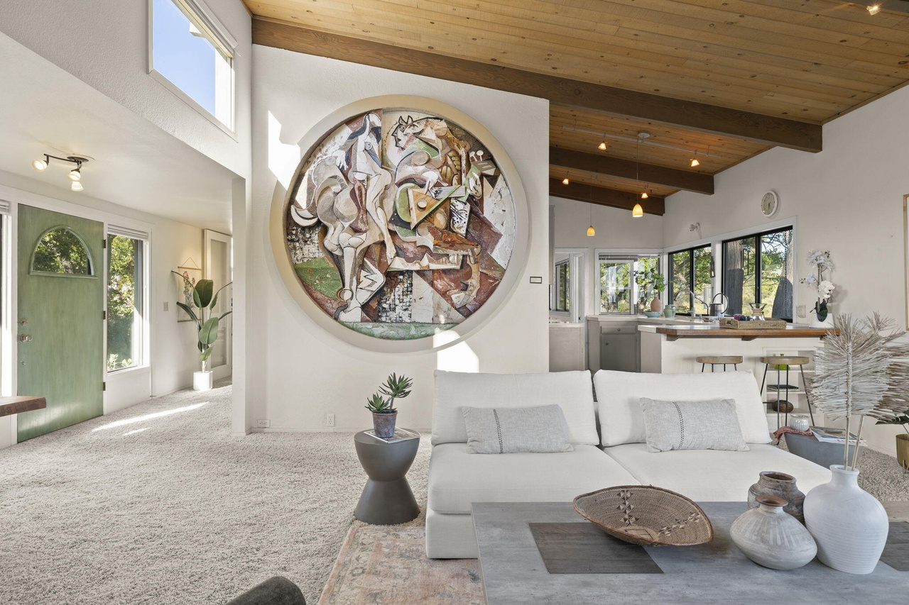 Here’s a fun one: 1807 Ladera Road ($2.995 million) on 9.77 acres in Ojai, “built in 1974 (est.) by acclaimed artist and Walt Disney’s most well known Production Designer, Frank Armitage.” The big round artwork—” mural created by Frank Armitage, reminiscent of his time spent working with Mexican Artist Siqueiros”—is included.