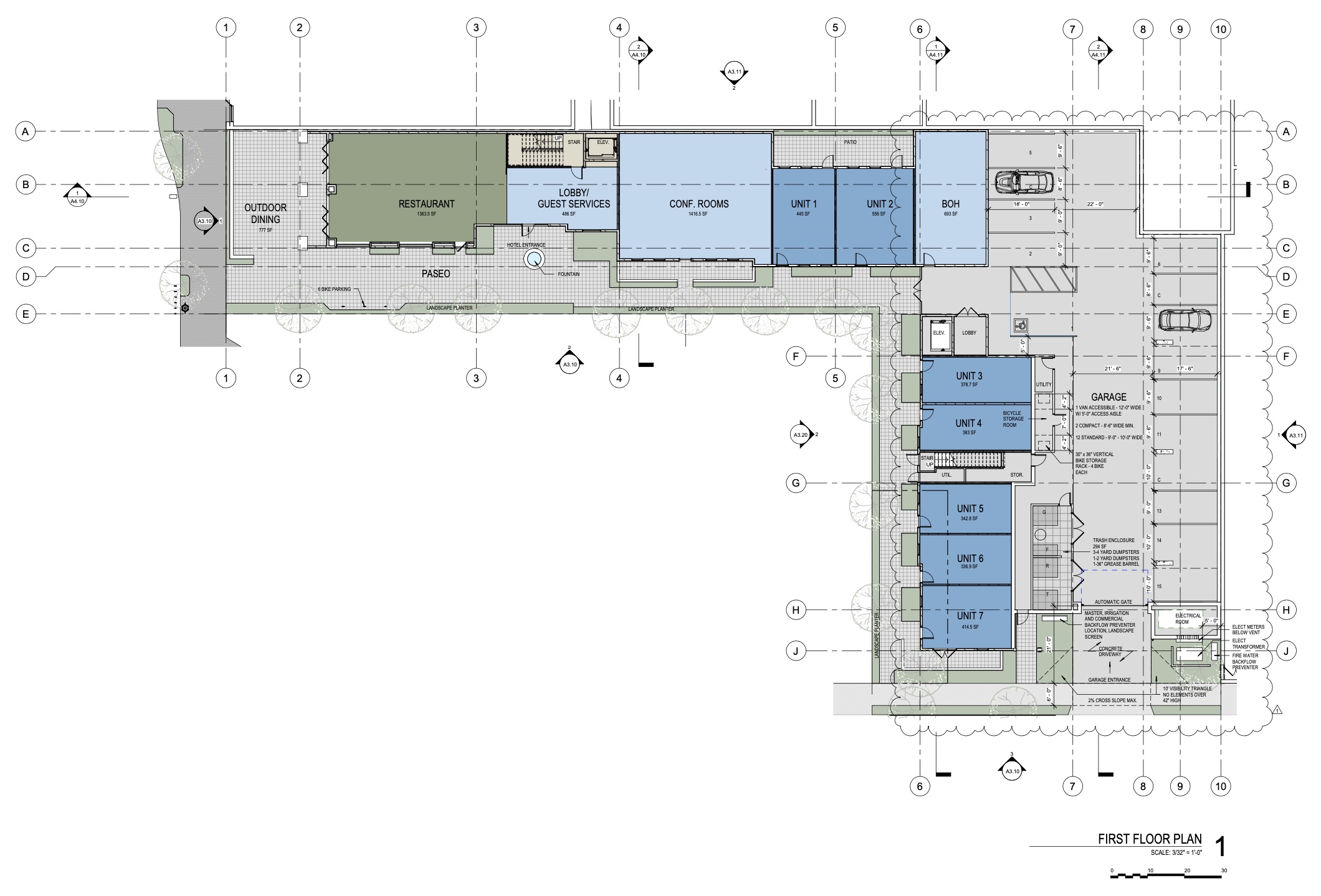 The ground-floor restaurant fronts State Street, with the small lobby tucked behind. I would imagine that the paseo is gated, seeing as how there are guest rooms along the paseo.