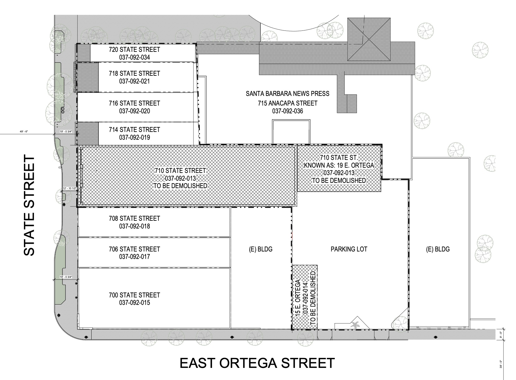 Now, however, the Press Room is on the ropes again—Knell evidently determined that the best way to solve the problem was to avoid residential altogether. The Historic Landmarks Commission’s December 7 agenda includes “a proposal to construct a 32,799-square-foot, four-story, 66-room hotel including a restaurant/bar and conference rooms on six lots totaling 30,004 square feet. The project also includes 16 parking spaces on the ground floor. A Lot Merger is required for the properties at 710-720 State Street and 15 E. Ortega Street. The 14,455-square-foot buildings at 710 State Street (including 19 E. Ortega) and the 1,000-square-foot building at 19* E. Ortega are proposed to be demolished. The remaining 6,071 square feet of existing nonresidential development will remain (714-720 State Street).” [*That’s a typo; the plans specify that 15 E. Ortega, a.k.a. the Press Room, is also being demolished.] This graphic included in the plans explains it better; the dark line indicates the boundary of the project.