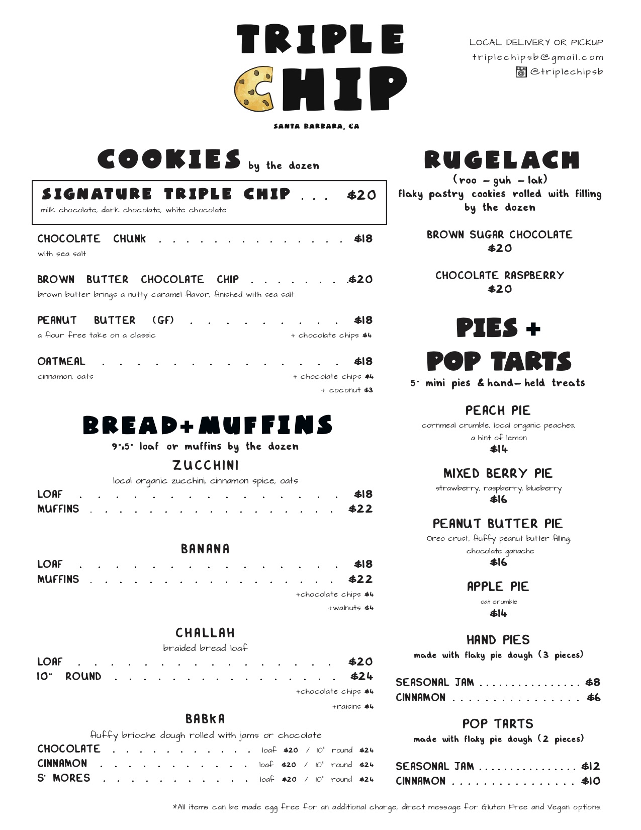 ••• Bettina sous chef Lindsay Koenig how has a full menu for her Triple Chip line of treats, available by delivery or pickup. I can vouch for the peach pie….