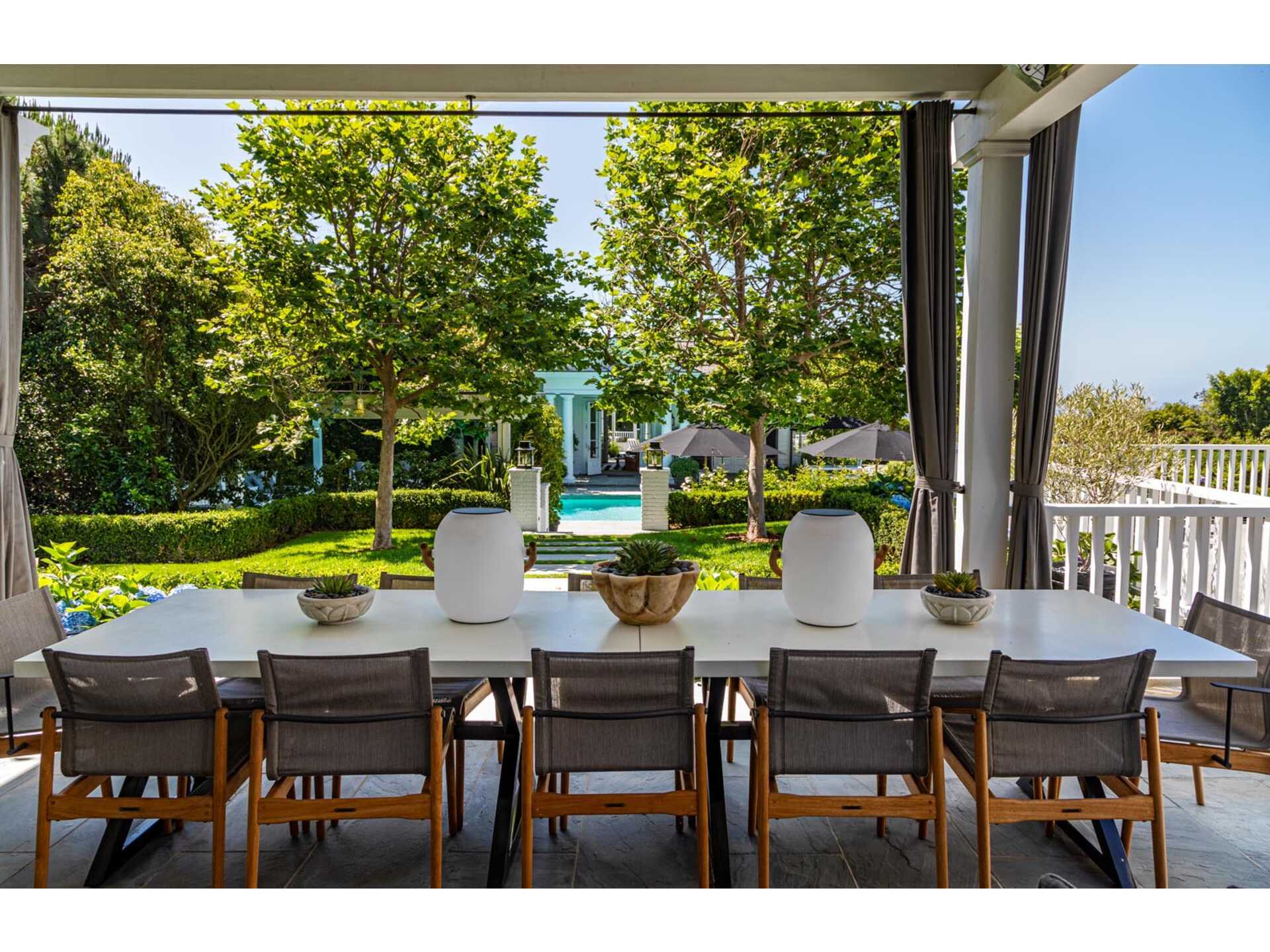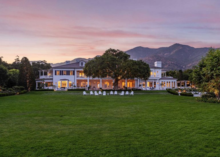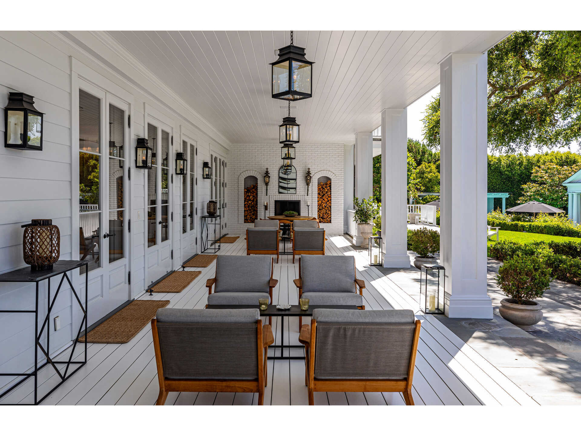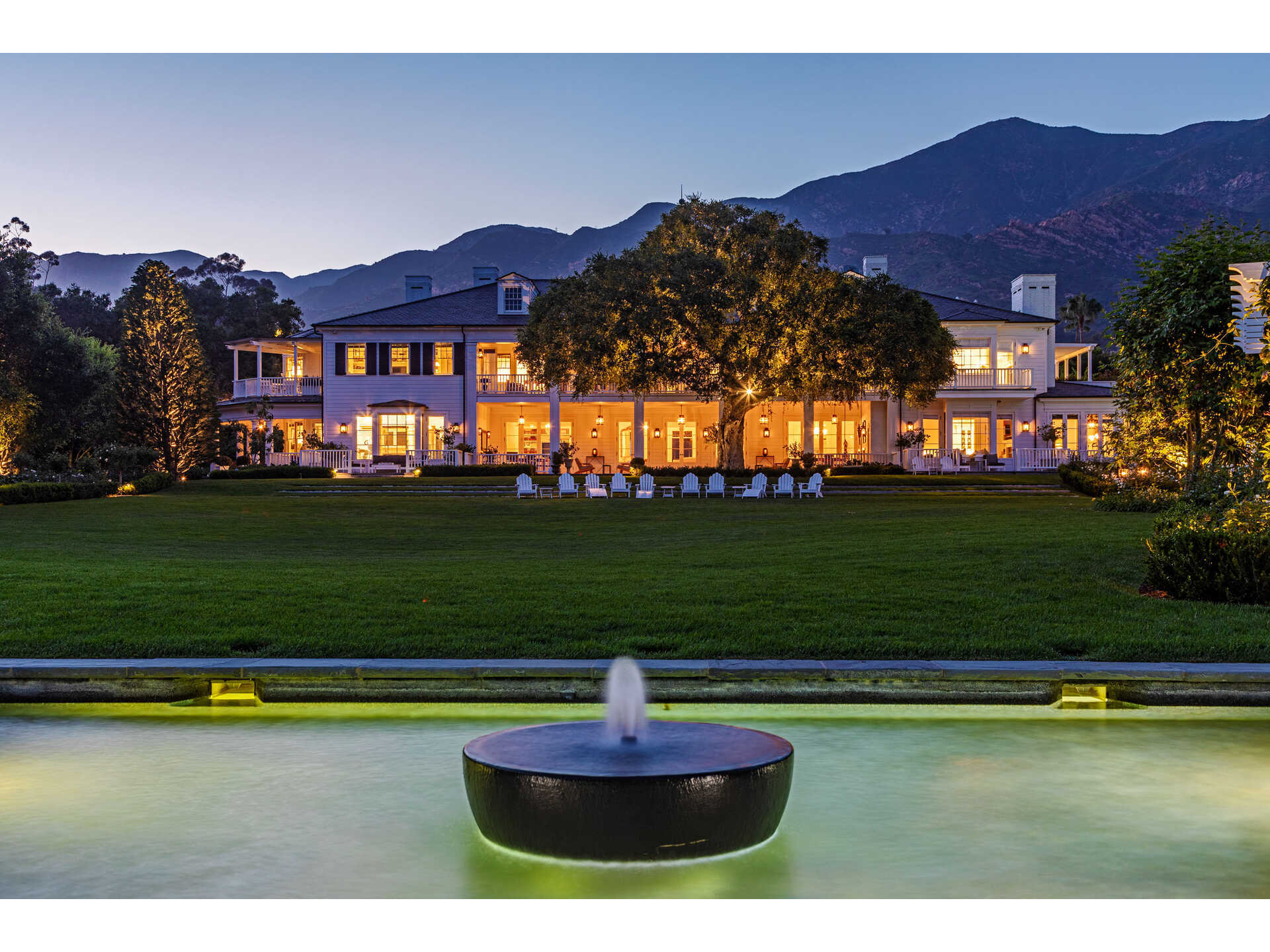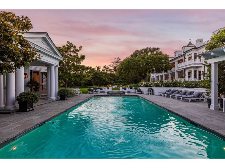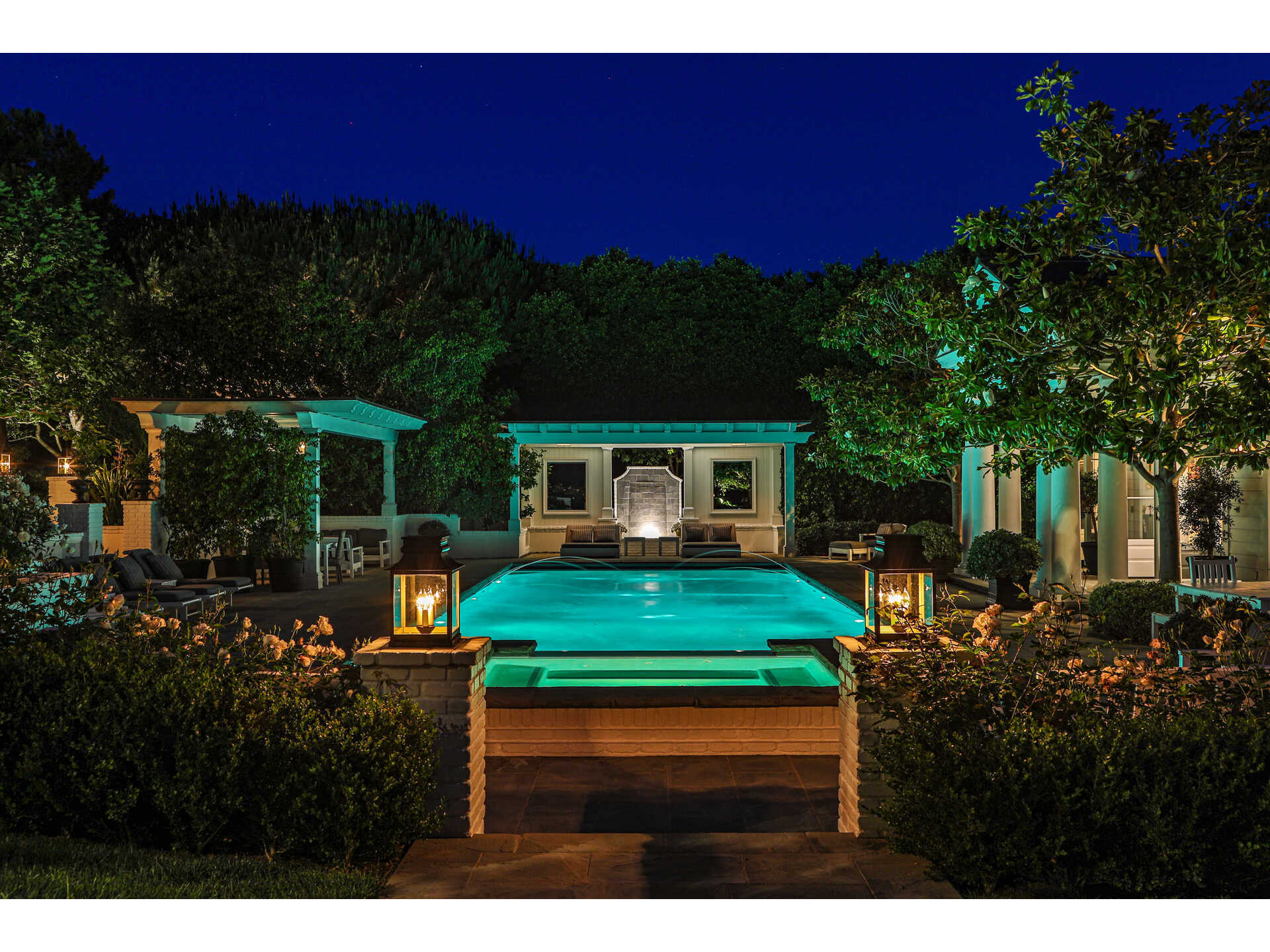 Located on prestigious Picacho Lane, the compound was designed by Don McNulty and completed in 2009. From the 2018 Los Angeles Times article about the first attempt: “The main house is comprised of 20 rooms, including a den/music room with a bar, family and commercial kitchens, an office, a screening room and a gym. The master suite has one of nine indoor fireplaces and a lavish bath for a total of six bedrooms and 9.5 bathrooms. […] The manicured grounds, which include two outdoor fireplaces, fountain features and a koi pond, were done by landscape architect Mark Rios and feng shui consultant David Cho. The guesthouse adds two additional bedrooms plus a kitchenette. Staff quarters, a bedroom and a full kitchen make up the pool house.”