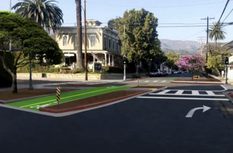 ••• Santa Barbara’s Historic Landmarks Commission had many objections to “the city’s proposal to run a fat wad of [hideous] green paint down the middle of Sola Street as part of the hard-fought battle to create a new safe cycling route connecting the city’s Eastside and Westside. […] The proposed Sola Street Paseo [would also] require some motorists to dog-leg off of Sola Street at certain intersections. Some HLC members objected to any change to the city’s historic grid. Others objected more to what they described as the ‘goofy’ aesthetics of the proposed plan.” It just shouldn’t be hard to make it look good. —Independent
