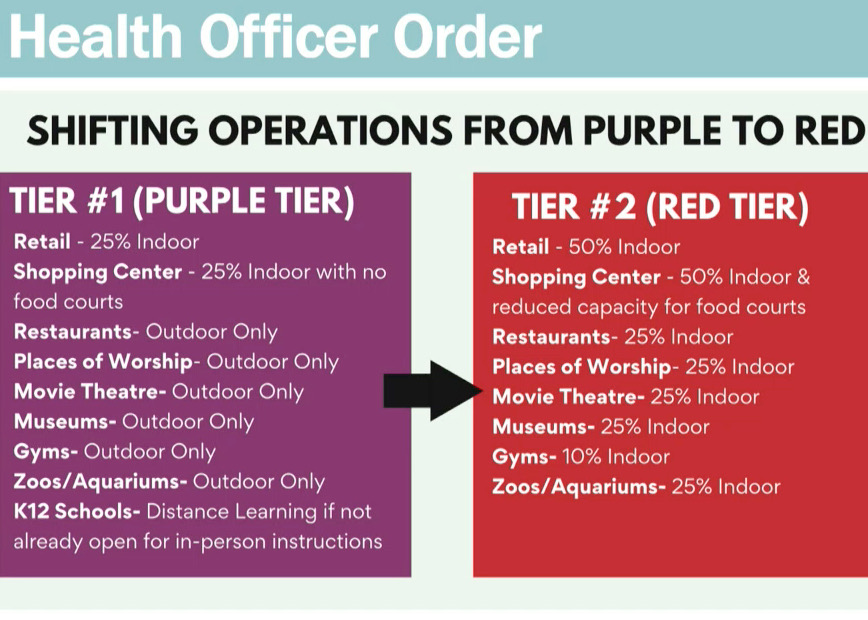••• “Santa Barbara, Ventura counties move up to state’s less-restrictive Red Tier, allowing more businesses to reopen,” reported KEYT. “The new rules will take effect on Wednesday [today].” The big change is that “restaurants can serve guests indoors with maximum capacity of 25% or 100 people, whichever is fewer.” And the Montecito Association sent out the handy graphic above, which I assume is from the county or state, along with the reminder that “we could be moving into the Orange Tier in 2 weeks, if we do not create another surge.”