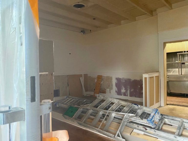 ••• Acme Hospitality is keeping mum about its plans for Paradise Cafe, but there’s clearly a lot of interior work going on. The door to the dining room was open yesterday, so I peeked in. And they’re evidently trying to decide which shade of gray to paint the exterior.