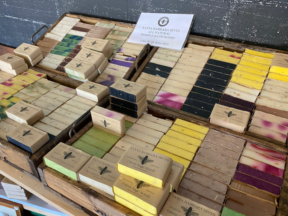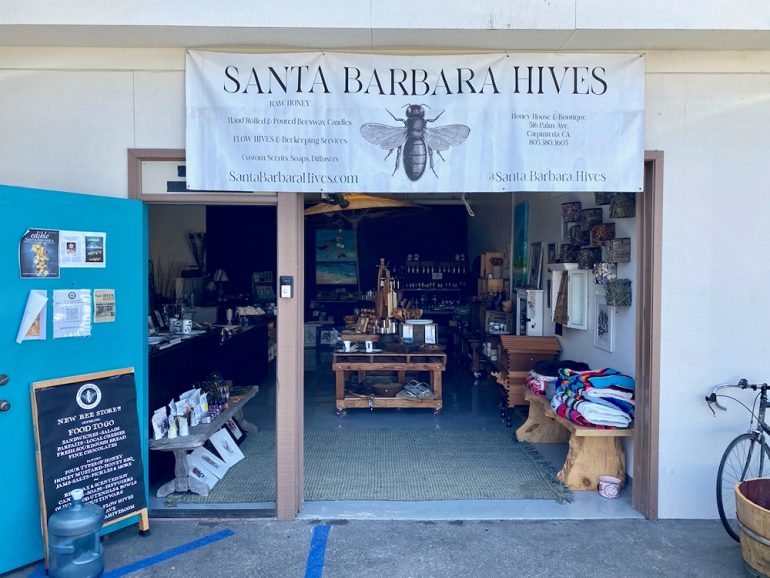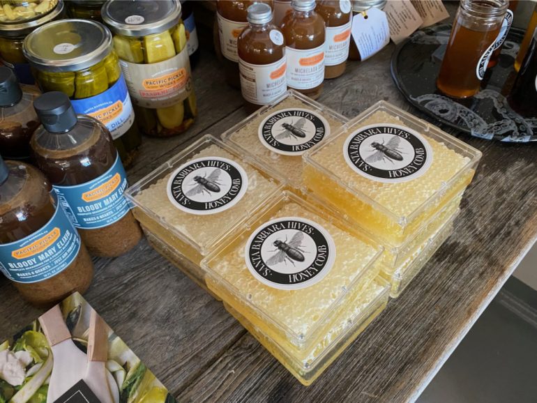 ••• As expected, Santa Barbara Hives has opened a shop at 516 Palm Avenue, a small industrial office park in Carpinteria, with merchandise that’s bee-related—honey, candles, soaps—and not.  I loved the mix of stuff in a surprising location; it feels like a find, and a real labor of love. Less expected is the extensive food component, which I’ll post about later.