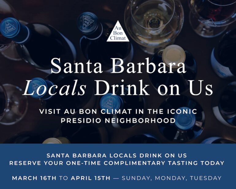 Santa Barbara locals, this one’s for you! We invite you to experience Au Bon Climat with a special offer just for our community. From March 16th to April 15th, enjoy a one-time-use complimentary wine tasting for you and a guest, available on Sundays, Mondays, and Tuesdays. This is our way of thanking our local community for your continued support and welcoming new guests to experience the wines of Au Bon Climat. Simply bring your ID with a Santa Barbara address and make a reservation to enjoy an afternoon of great wine. Reservations are required to receive the complimentary tastings.