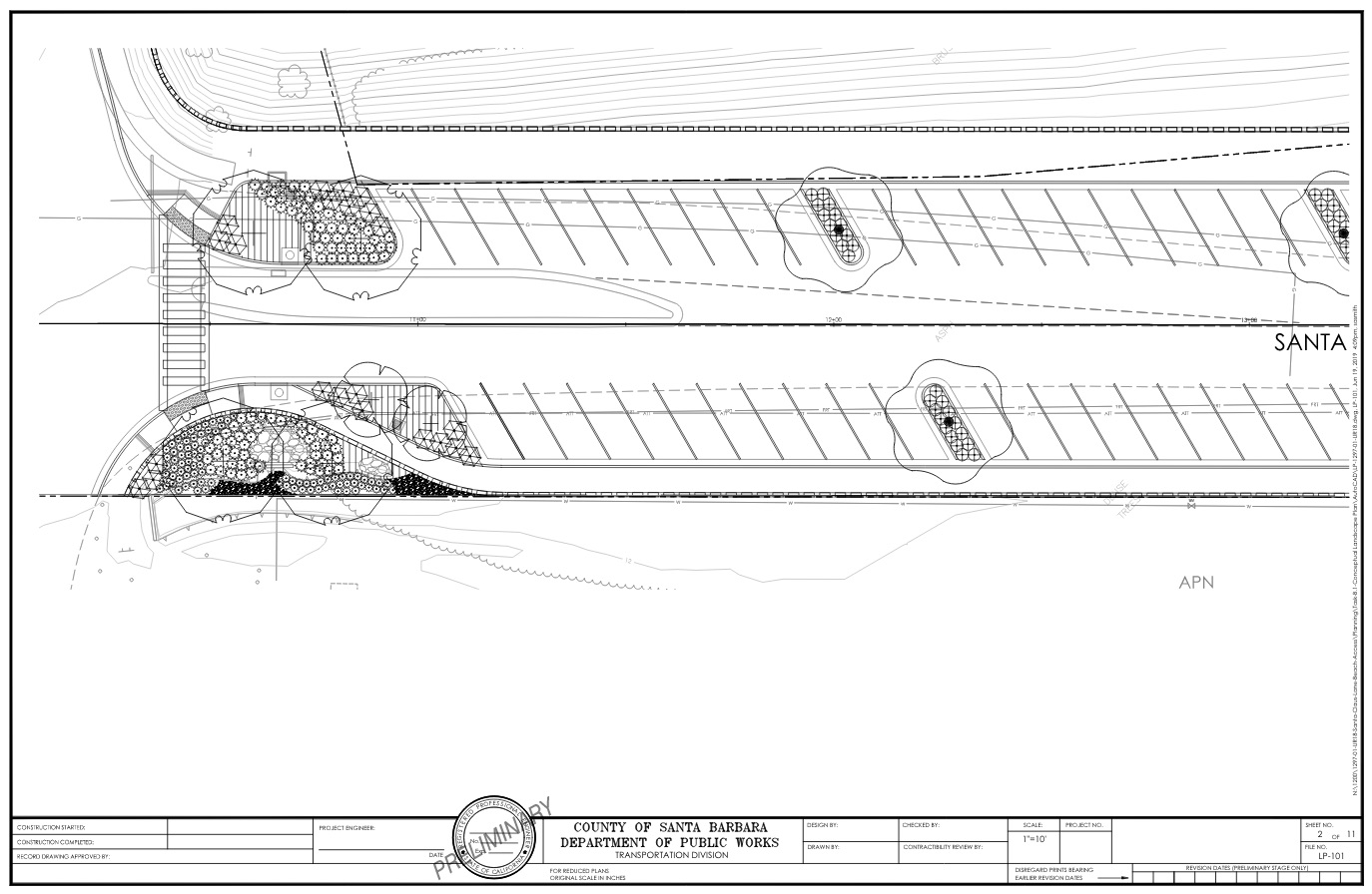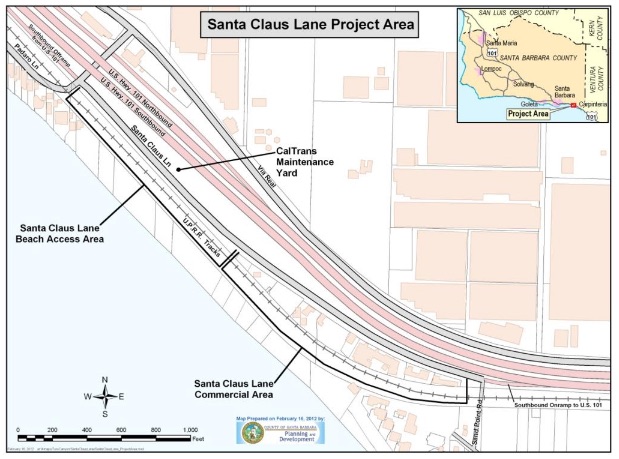 The project would construct a new separated Class I bikeway/multi-use path on the north side of Santa Claus Lane. California Coastal Trail signs would be installed on both ends of the multi-use path connecting the existing Class II bikeway along Via Real to the northeast to the Santa Claus Lane Bikeway, a proposed Class I bikeway that would extend from Spindrift Lane/Sand Point Road to Carpinteria Avenue in the City of Carpinteria. The south side of Santa Claus Lane will include an ADA-compliant sidewalk. Six new pedestrian crosswalks would connect the proposed multi-use path along the northern side of the roadway to the sidewalk, beach access, and commercial area along the southern side of the roadway.Signage