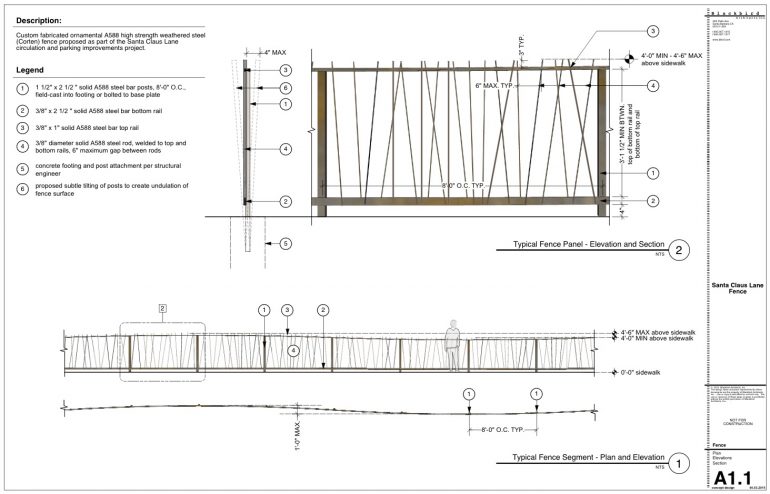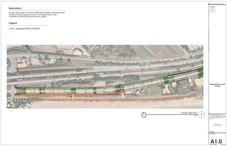 The project would replace the existing chain link fencing separating the north side of Santa Claus Lane from Caltrans ROW with new retaining walls, separating the multi-use path from the Caltrans storage yard and U.S. 101 to the north. Where possible, an 8 inch to 2 foot high concrete curb wall would be constructed to keep earthen materials from entering the multi-use path. Retaining walls would measure between 2 feet to 6 feet in height and vary between soldier piles with concrete lagging and reinforced concrete walls. Chain link fencing is proposed immediately behind the retaining walls and concrete curb walls in order to serve as a denial barrier to the Caltrans storage yard and U.S.101. A reinforced concrete barrier rail may also be required in locations along the retaining wall where Santa Claus Lane and U.S. 101 are in close proximity, where necessary for safety.The project includes a retaining wall and decorative fence on the beach side of the proposed ADA-compliant sidewalk. The wall and fence would extend from Padaro Lane to the commercial area, separating County ROW from UPRROW, and directing beach users to the proposed pedestrian at-grade railroad crossing.