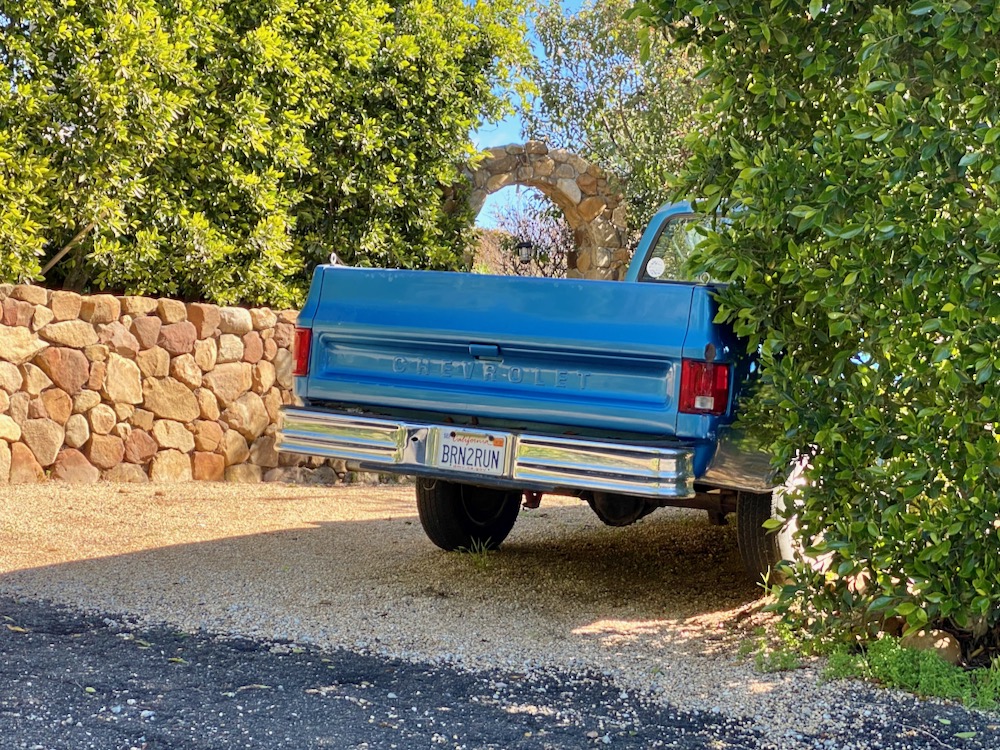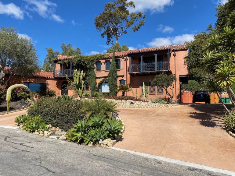 Camino Alto isn’t a spur—it runs into Conejo Road—but I insisted we check it out anyway, because I wanted a better look at the house below, which I had noticed while visiting the newly built 20 Camino Alto (on the market for $8.499 million). 44 Camino Alto was built in 1974, and judging from undated Zillow photos of a rental unit on the property, it’s a full-on Monet. But wow, what an entrance!