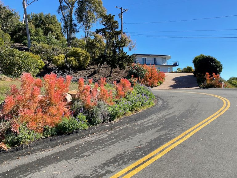 There’s quirk on Camino Alto, too: a herd of goat sculptures; a hexagonal roof doodad, a.k.a. Juicer of the Gods; and a four-eyed mailbox monster that eats plants.