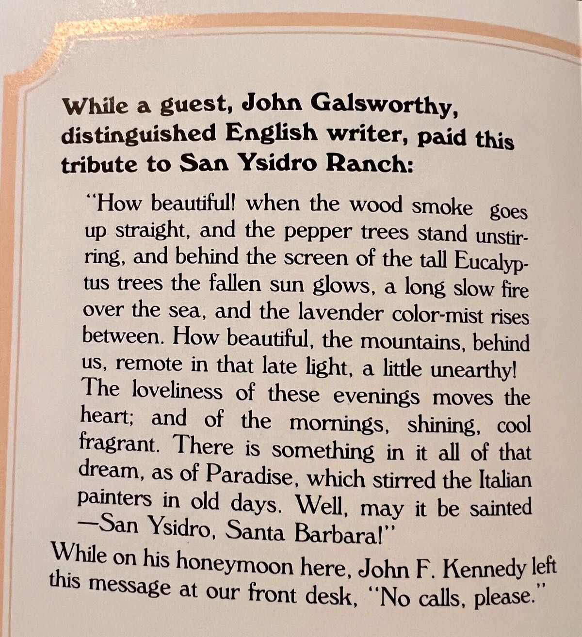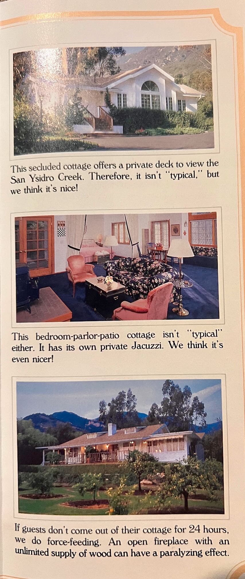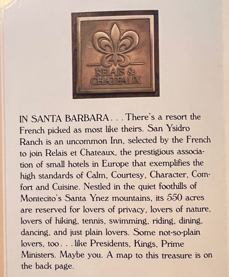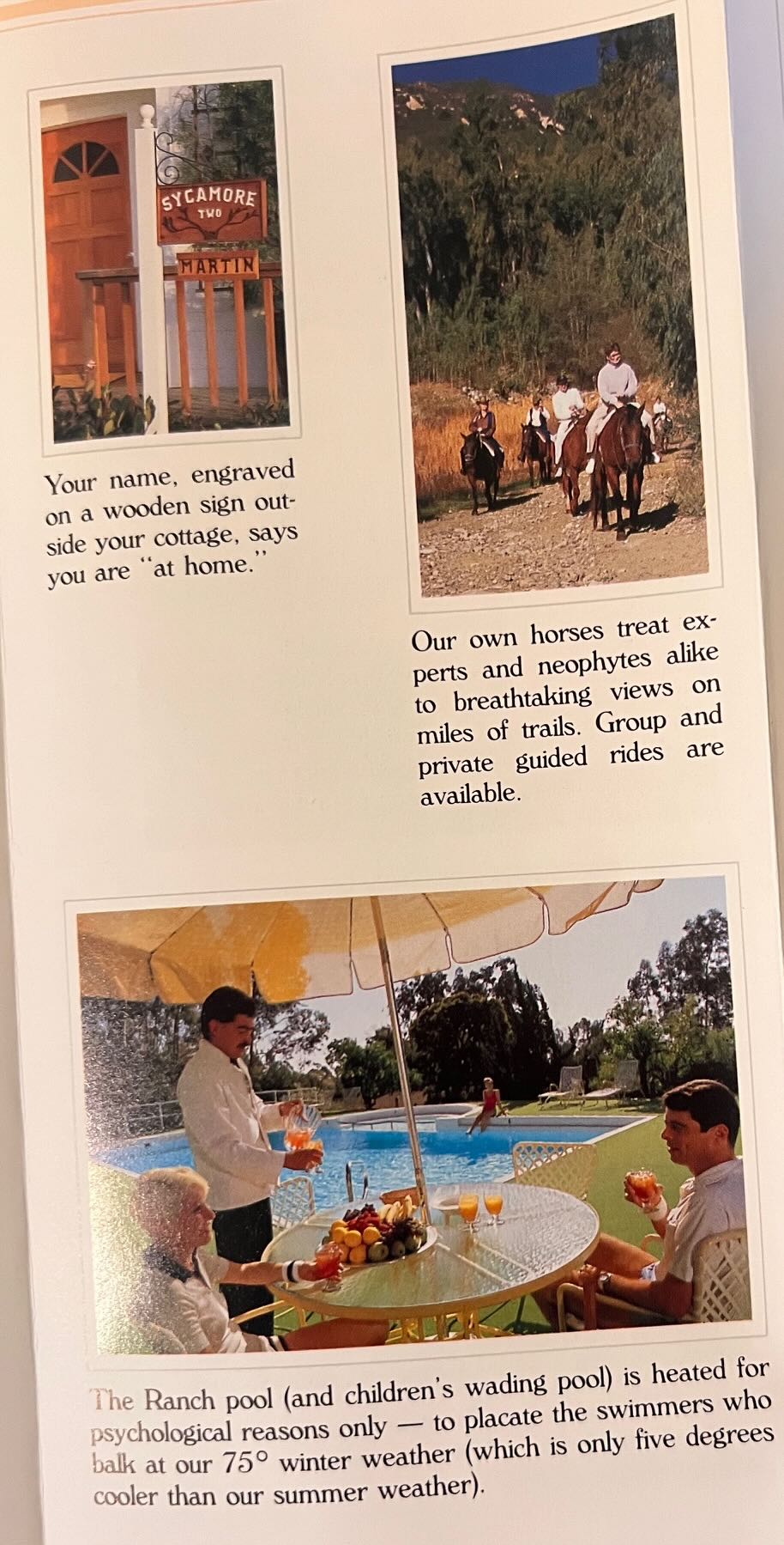 ••• After I posted about the botanical garden under construction at the San Ysidro Ranch, A. sent over photos of a brochure from the 1980s (or at least that’s my guess, based on the hairstyles). While some of it—the threat of force-feeding, e.g.—hasn’t aged all that well, it’s an amusing read and a reminder of when the property was considerably more down to earth.
