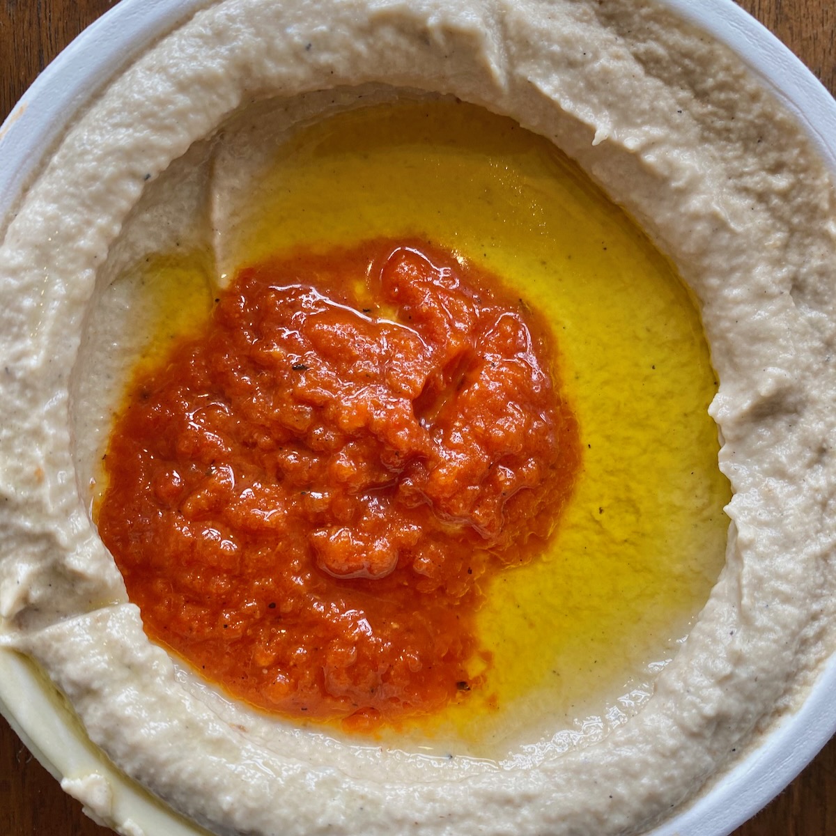 ••• Tamar is now open for lunch Thursday through Saturday. (The full hours are 11:30 a.m. to 8 p.m.). Below: baba ganoush with adjika, new to the menu. It’s delicious! But if you order it to go, it gets packaged like the hummus that comes with the platters—the bowl is lidless, inside a cardboard container. Don’t go swinging the bag around.