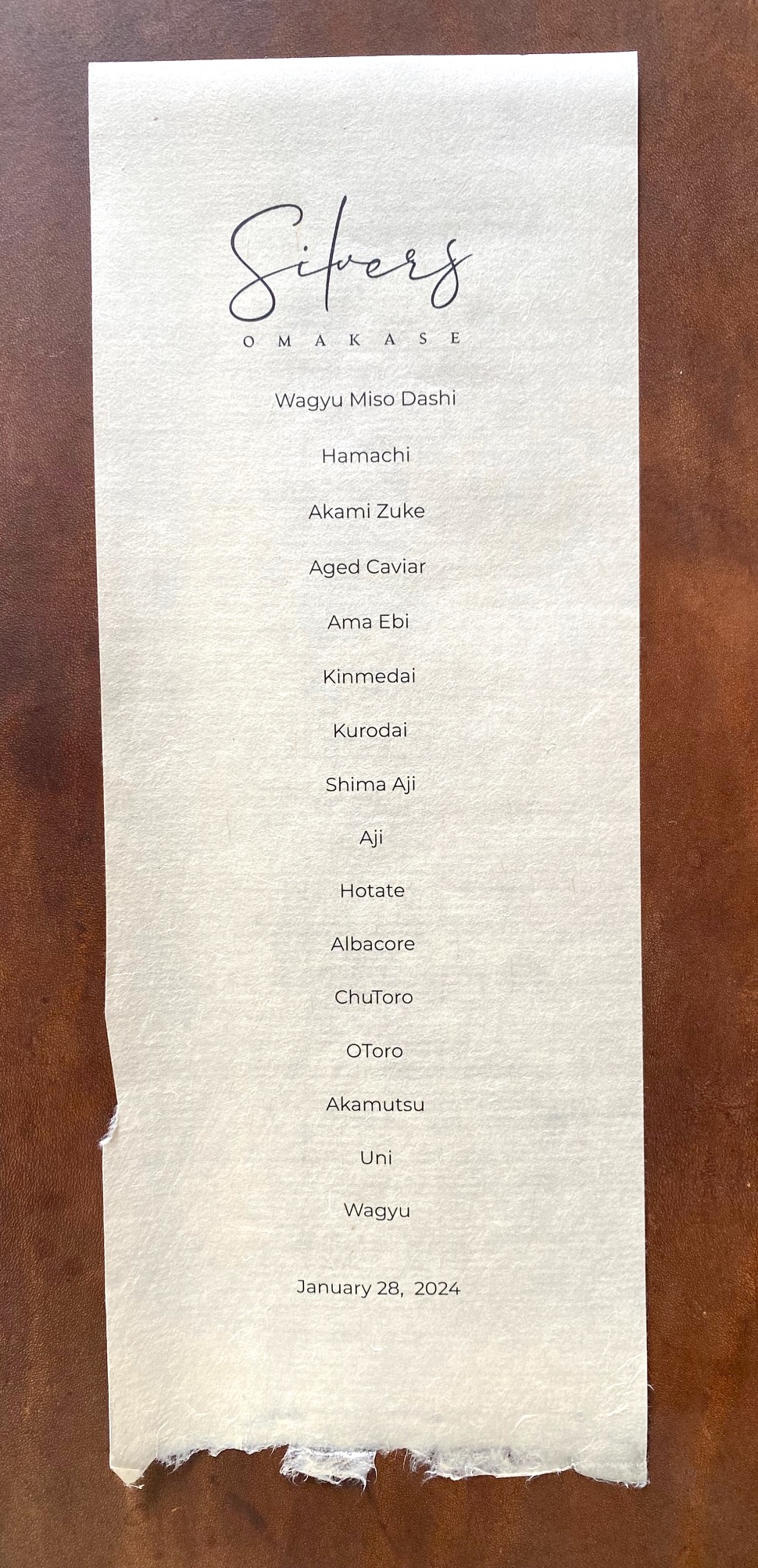 The two-hour dining experience ($185, plus beverages, tax, and gratuity) is designed to offer Lee and his team maximum flexibility, with anywhere from 13 to 20 courses, depending on what’s available and in season. “The menu is 75 percent sushi and 25 percent plated courses,” says Lee. This sample menu gives you a vague idea of what to expect….