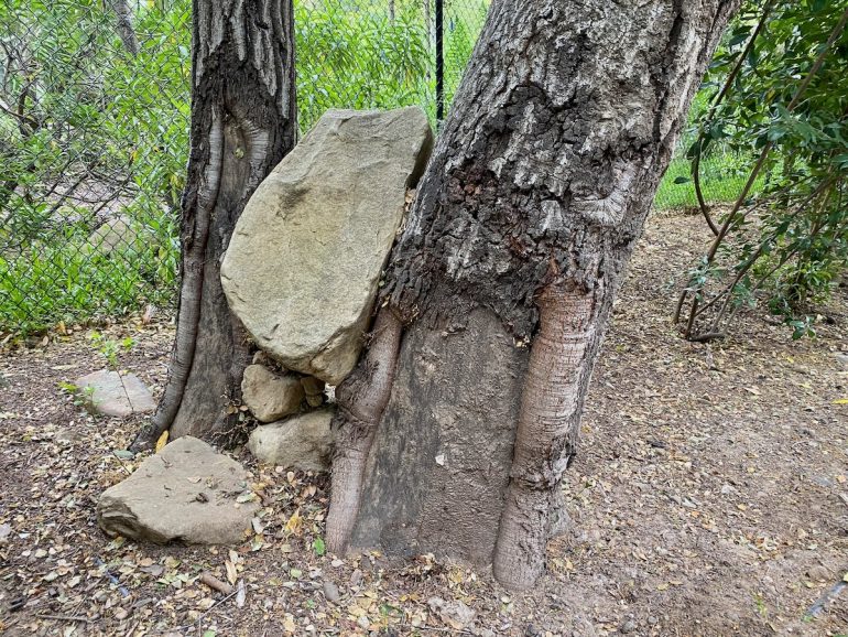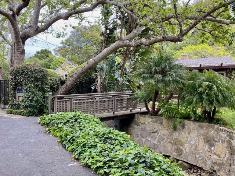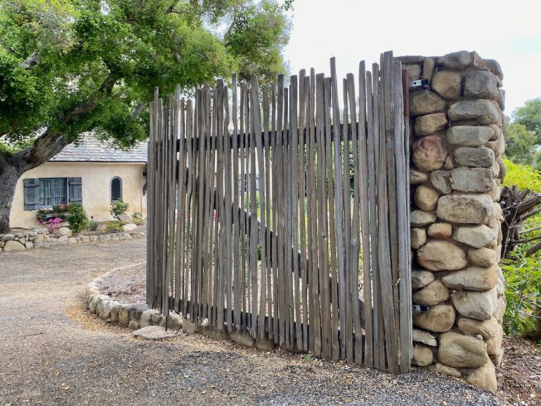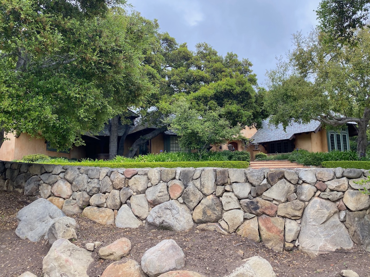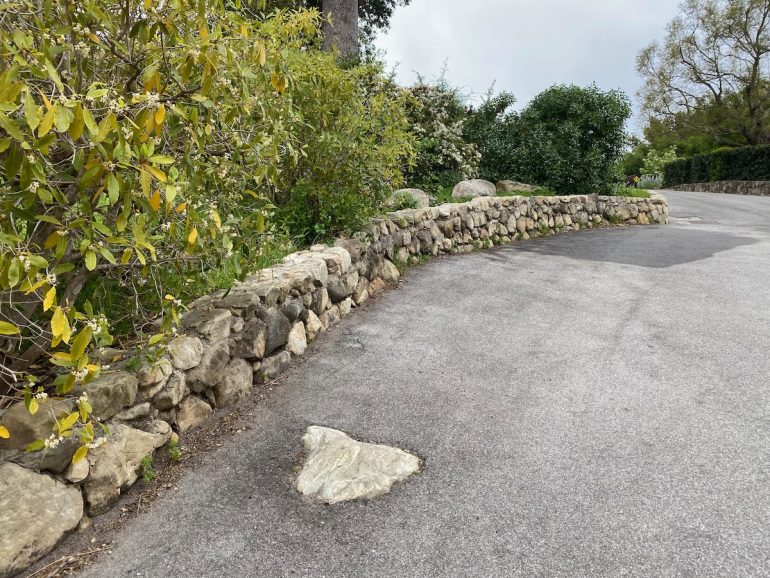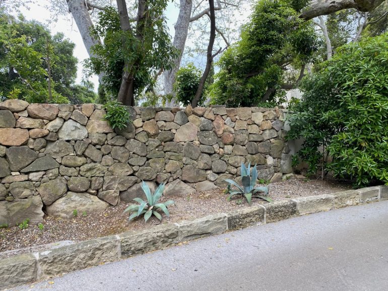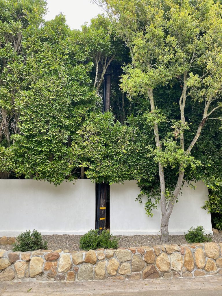 The rap against walking in Montecito is that there’s not much to see but gates, but as we headed north on Lilac, we were rewarded with a large rock wedged between tree trunks and some lovely stone walls.