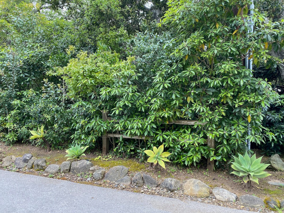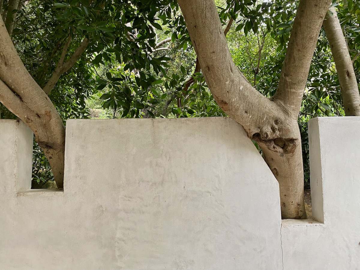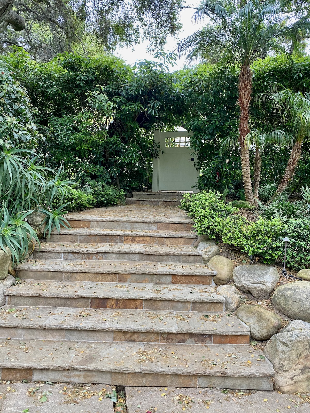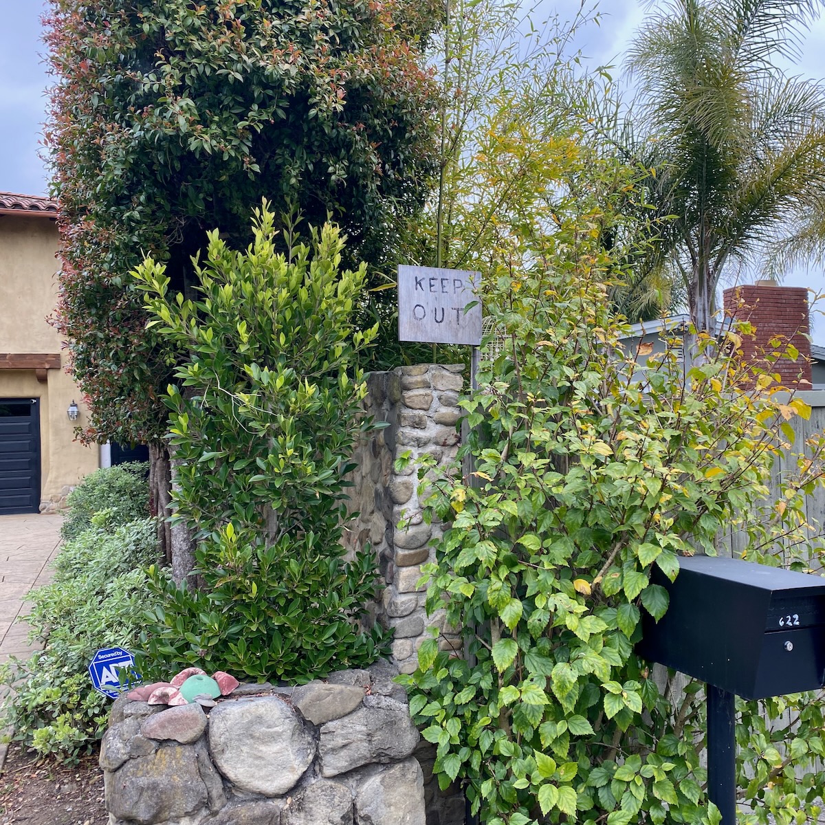 The rap against walking in Montecito is that there’s not much to see but gates, but as we headed north on Lilac, we were rewarded with a large rock wedged between tree trunks and some lovely stone walls.