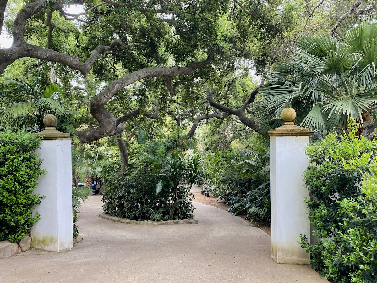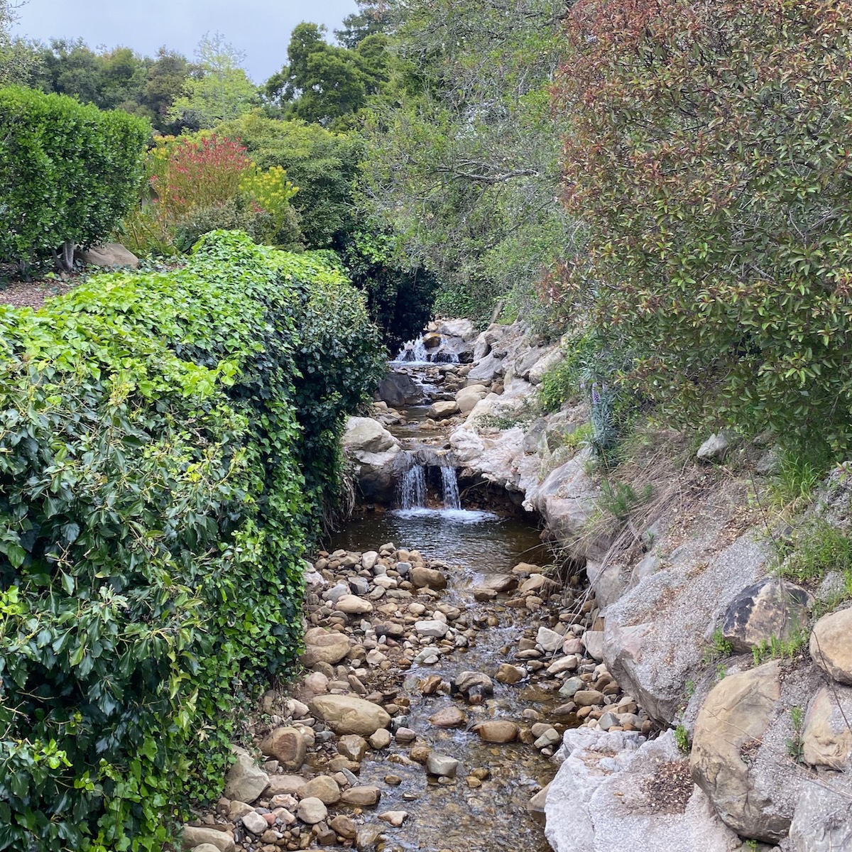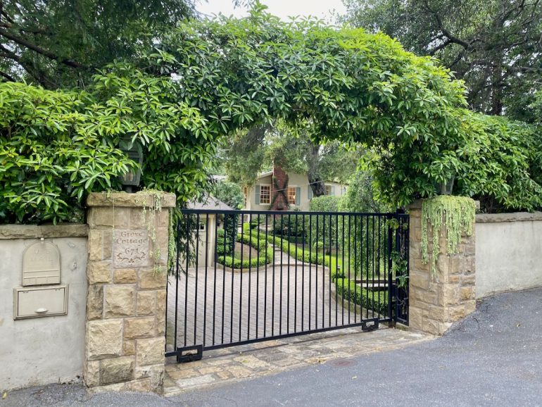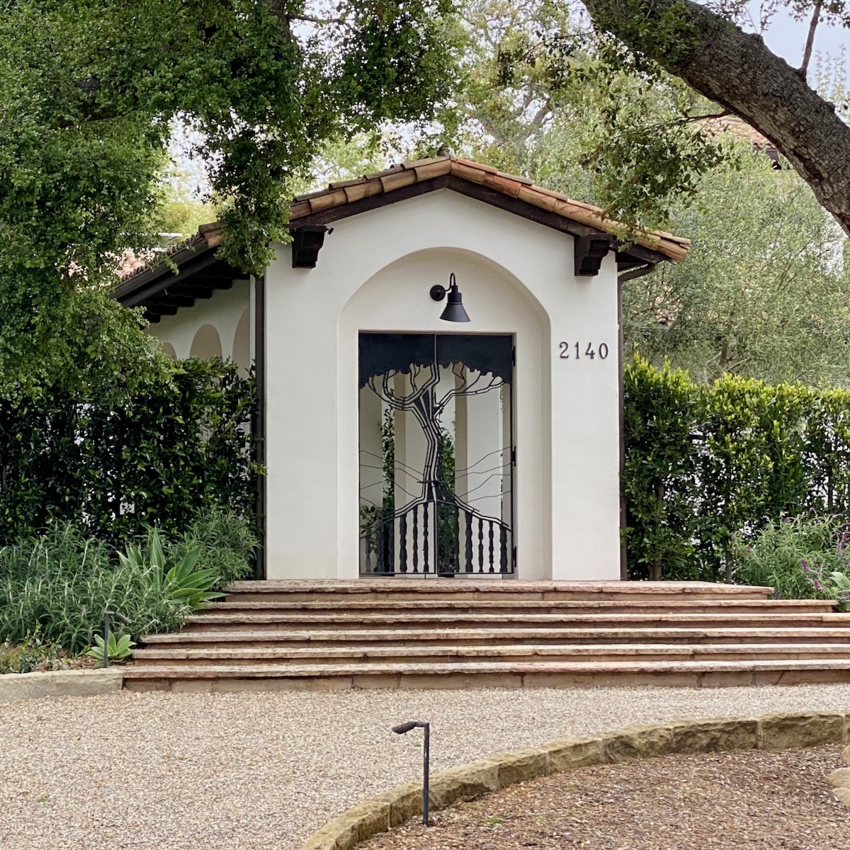 The rap against walking in Montecito is that there’s not much to see but gates, but as we headed north on Lilac, we were rewarded with a large rock wedged between tree trunks and some lovely stone walls.