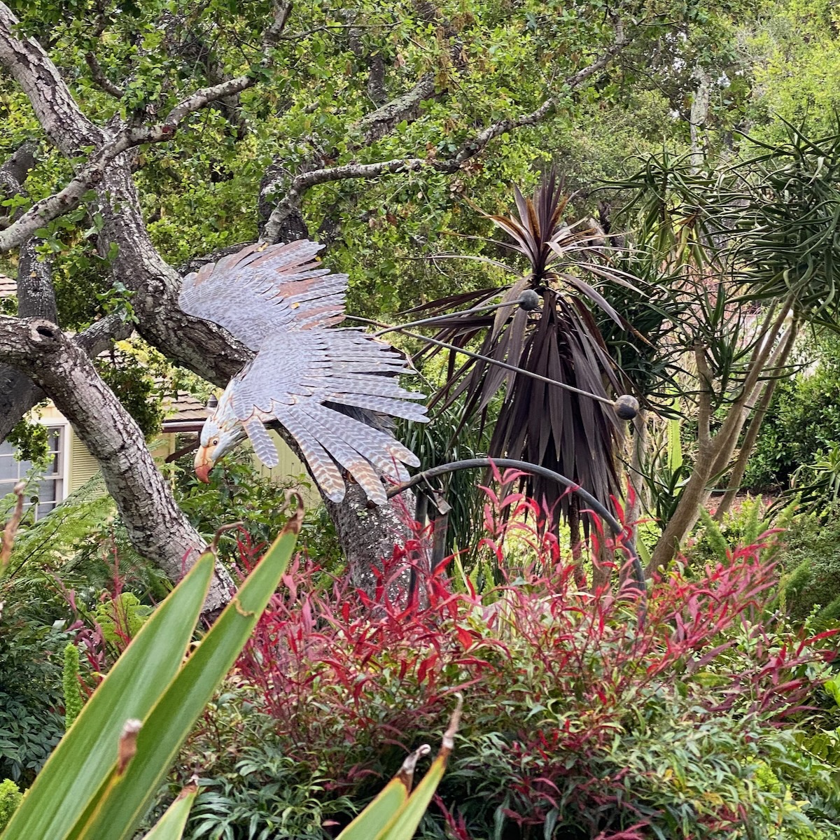 More details: a vestigial fence segment, a pretty pedestrian gate, a gas lamp (are those even allowed anymore?), and a raptor sculpture that I hope is kinetic.