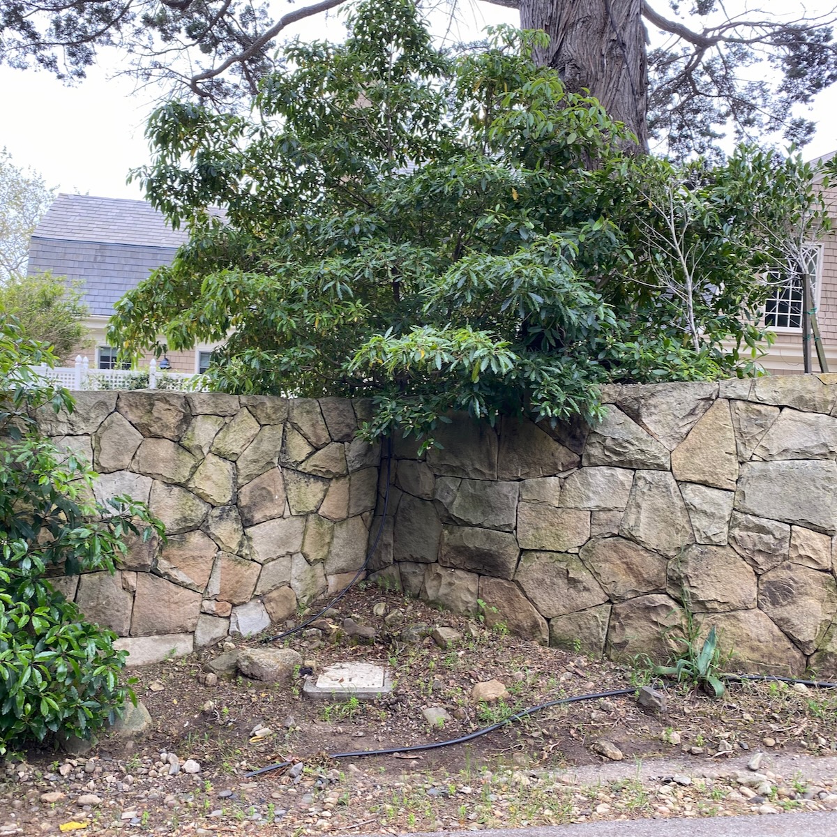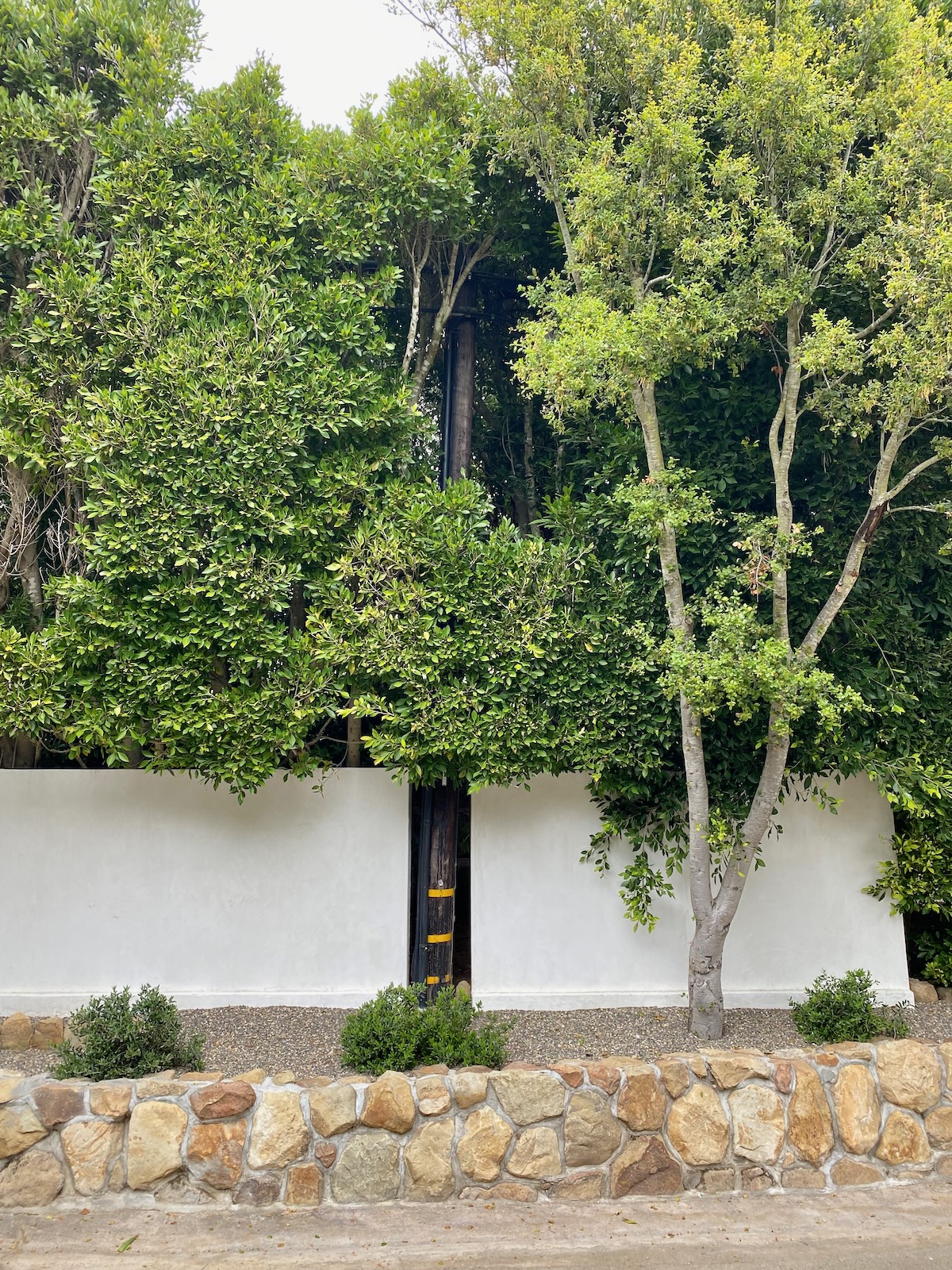 And I must always pay respect to walls that make way for trees. The utility pole was more of a surprise, particularly because the wires run through the middle of the foliage—when that sort of thing happens near my house, the utilities arrive in a heartbeat to scalp the tree.