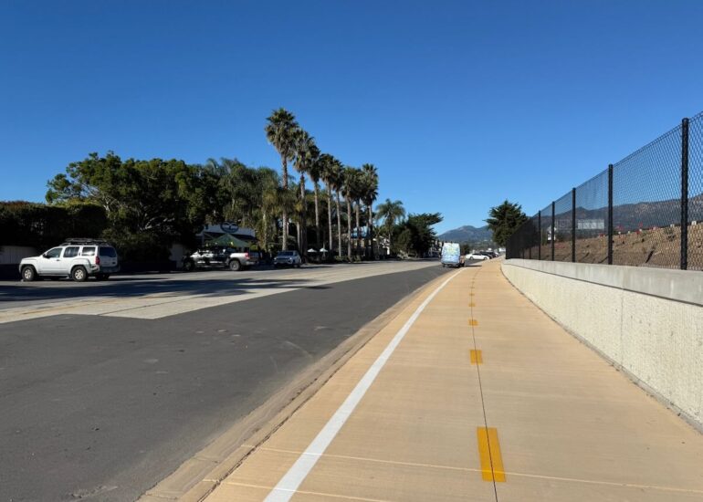 ••• The bike lane on the north side of Santa Claus Lane has come a long way. On one hand, yay for safety. On the other hand, might it not be a little bit of a bummer to bike between parked cars and a chain-link fence?