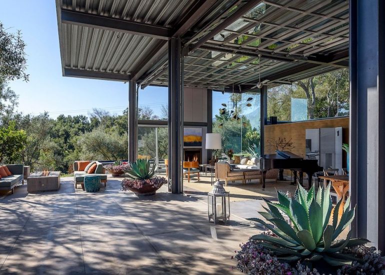 Steel and glass are the primary materials listed for the Barton Myers–designed house at 770 Ladera Lane, but the ones that first come to mind are light and air.