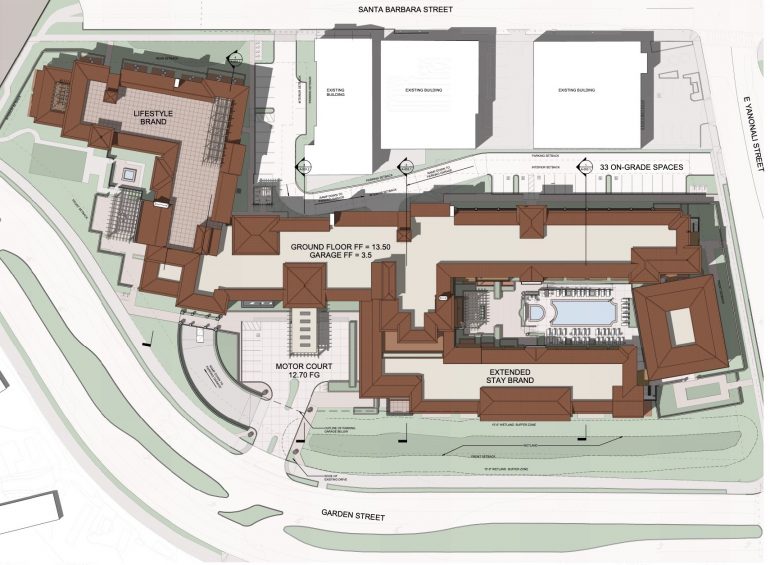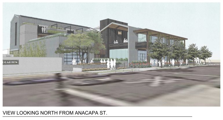 The Cabrillo Plaza Specific Plan of 1983 included hospitality as a possible use for the lot at 101 Garden Street (at the southwest corner of Yanonali), but when the Wright family’s plan finally went before the city’s Planning Commission in early April, commission members complained about the lack of housing. “If an applicant can’t rely on a specific plan, then what the hell are we asking specific plans for?” said architect Brian Cearnal, whose Cearnal Collective designed the 250-room property (120 standard rooms and 130 extended-stay). As for what’s next, Noozhawk had this: “Rather than an outright denial, the commissioners voted 6-0 to ‘continue’ the project, to give the developers time to study employee housing, do outreach to the neighborhood, and work with existing tenants on the site. Cearnal indicated that any employee housing would have to go on a third story, which would increase the height of the building about 45 feet. The developers plan to return to the commission in about 60 days.” More renderings here.