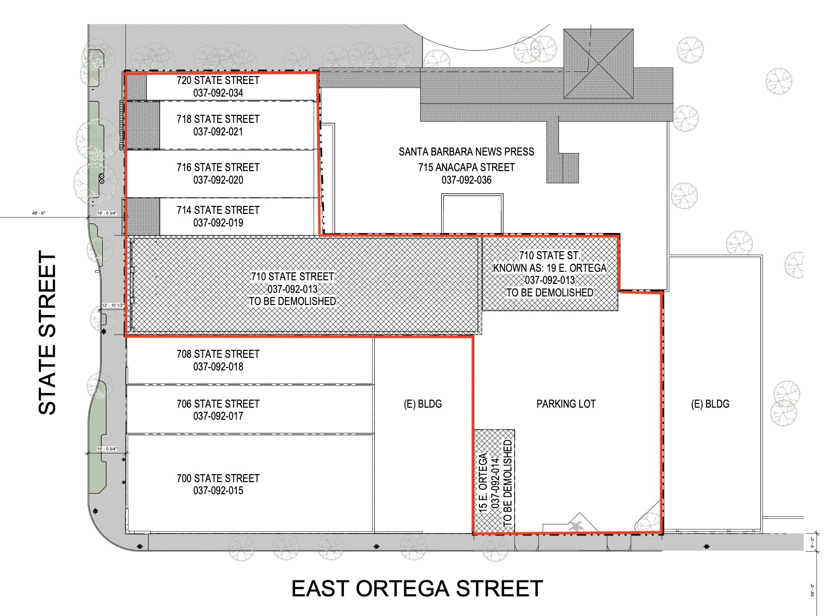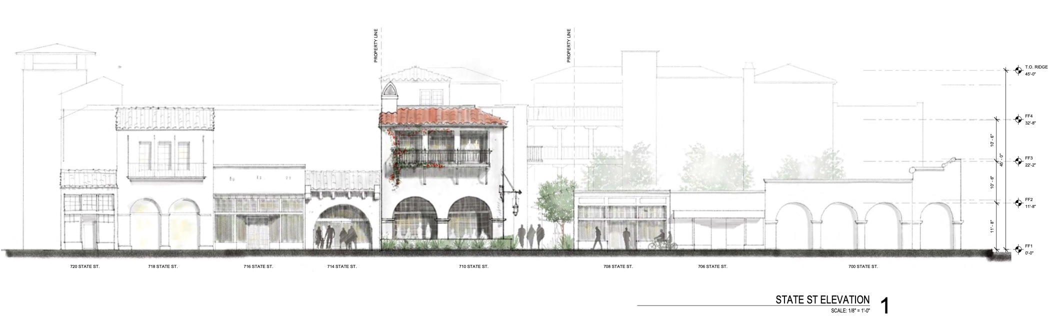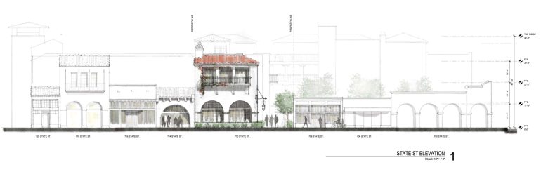 Further up State Street, SIMA is proposing to replace the building currently home to Restoration Hardware (710 State Street); the adjacent building directly behind the Santa Barbara News-Press building (19 E. Ortega Street); the Press Room bar at 15 E. Ortega; and a large parking lot with a 32,799-square-foot, four-story, 66-room hotel including two restaurants. (The buildings at 714-720 State Street are also part of the project but they won’t be demolished.) The design, by Kevin Moore Architect, includes varied facades that give the feel of a village street and a paseo running from State to Ortega. The project sailed through the Historic Landmarks Commission; the Planning Commission is up next. More images here.