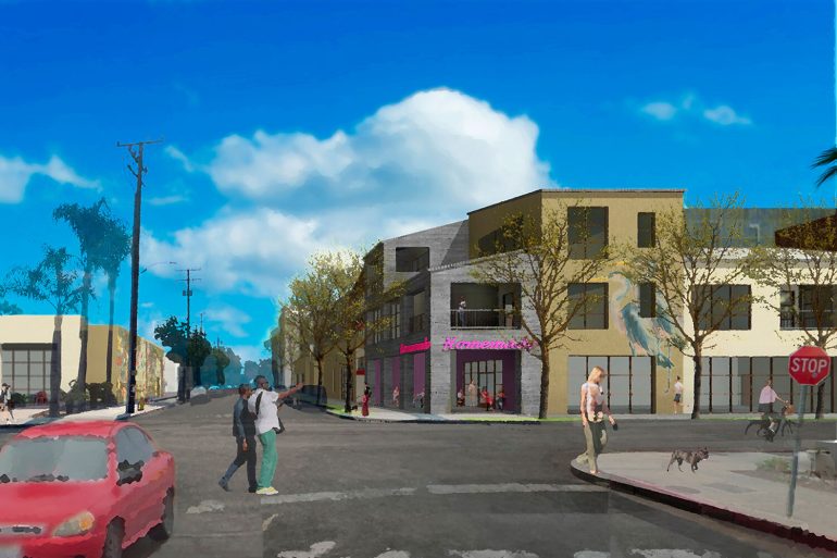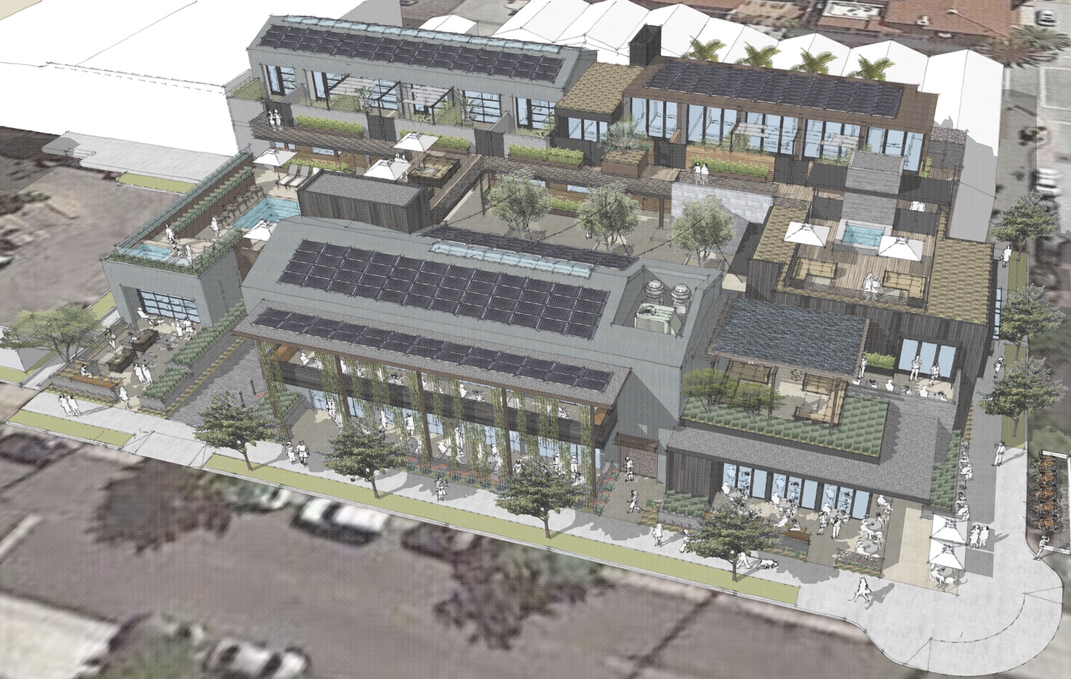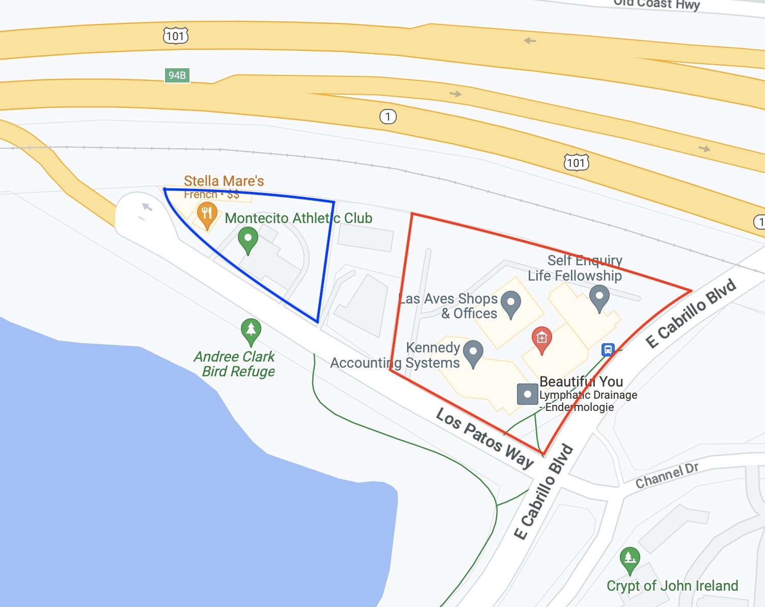 L.A. developer Runyon, known for Platform in Culver City, is revamping the Las Aves complex (outlined in red) across from the Andrée Clark Bird Refuge into The Post, a retail center with many shops, two restaurants, and two smaller food-and-beverage outlets. The company also bought the Montecito Athletic Club and Stella Mare’s buildings (in blue); its plans for those remain unknown—and possibly up in the air till it either gets its hands on one or both of the other buildings (Magic Castle Cabaret and the apartments to the north) or gives up. More renderings can be found here and here.